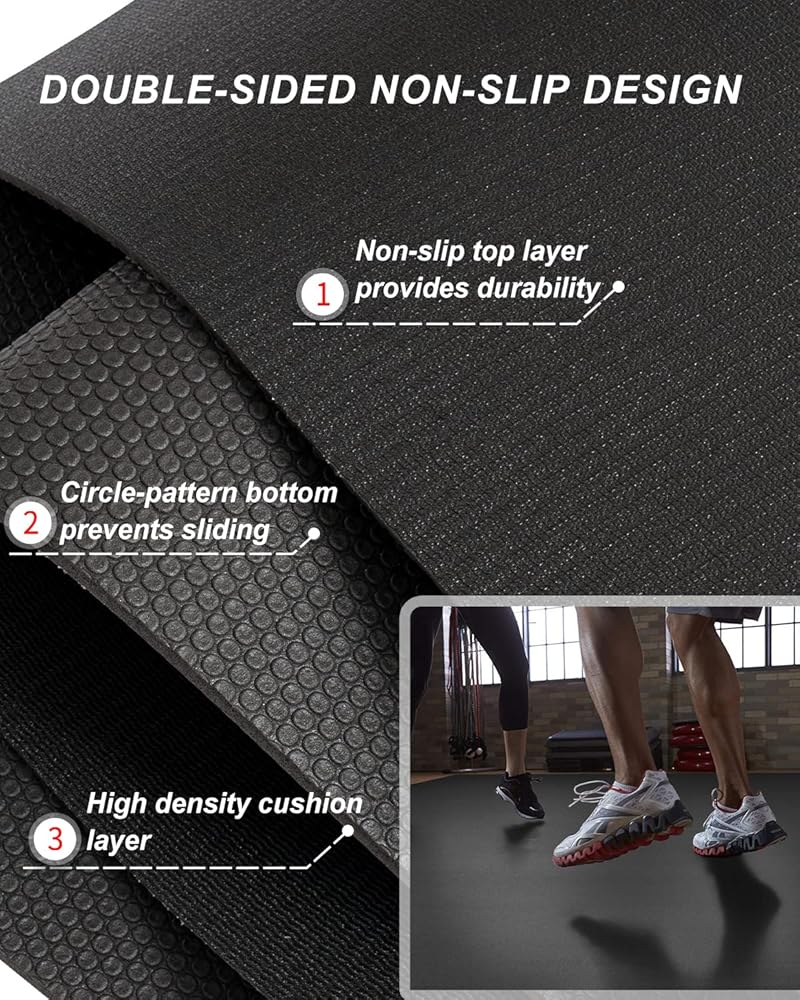 تصميم مزدوج الجوانب مانع للانزلاق: الجزء العلوي من سجادة التمرين مصنوع من مادة PVC التي ستمنع التمزق والخدش، ومقاومة الأضرار ضد التأثيرات العالية الناجمة عن سقوط المعدات مثل الأثقال والدمبل أثناء التدريب، ومقابض سفلية بنمط دائري وتمنع السجادة من الانزلاق