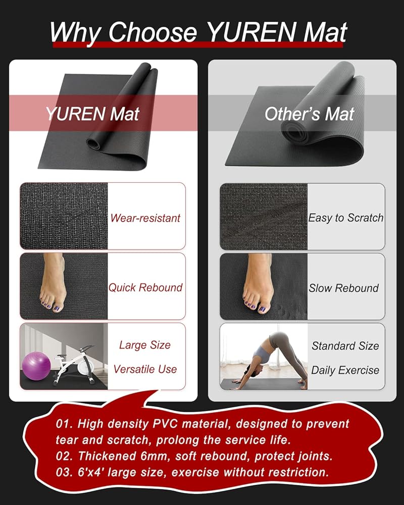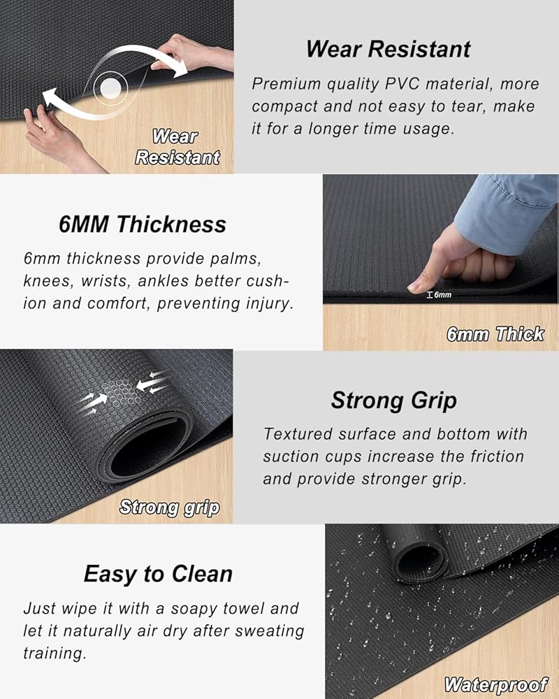 حماية الأرضية وراحة مفاصلك: سمك 6 مم يوفر راحة أفضل لراحة اليد والركبتين والمعصمين والكاحلين مع الحفاظ على التوازن. تعمل السجادة بشكل رائع على جميع الأرضيات بما في ذلك الخشب الصلب والسجاد والخرسانة والبلاط في غرفة المعيشة أو المرآب أو الطابق السفلي