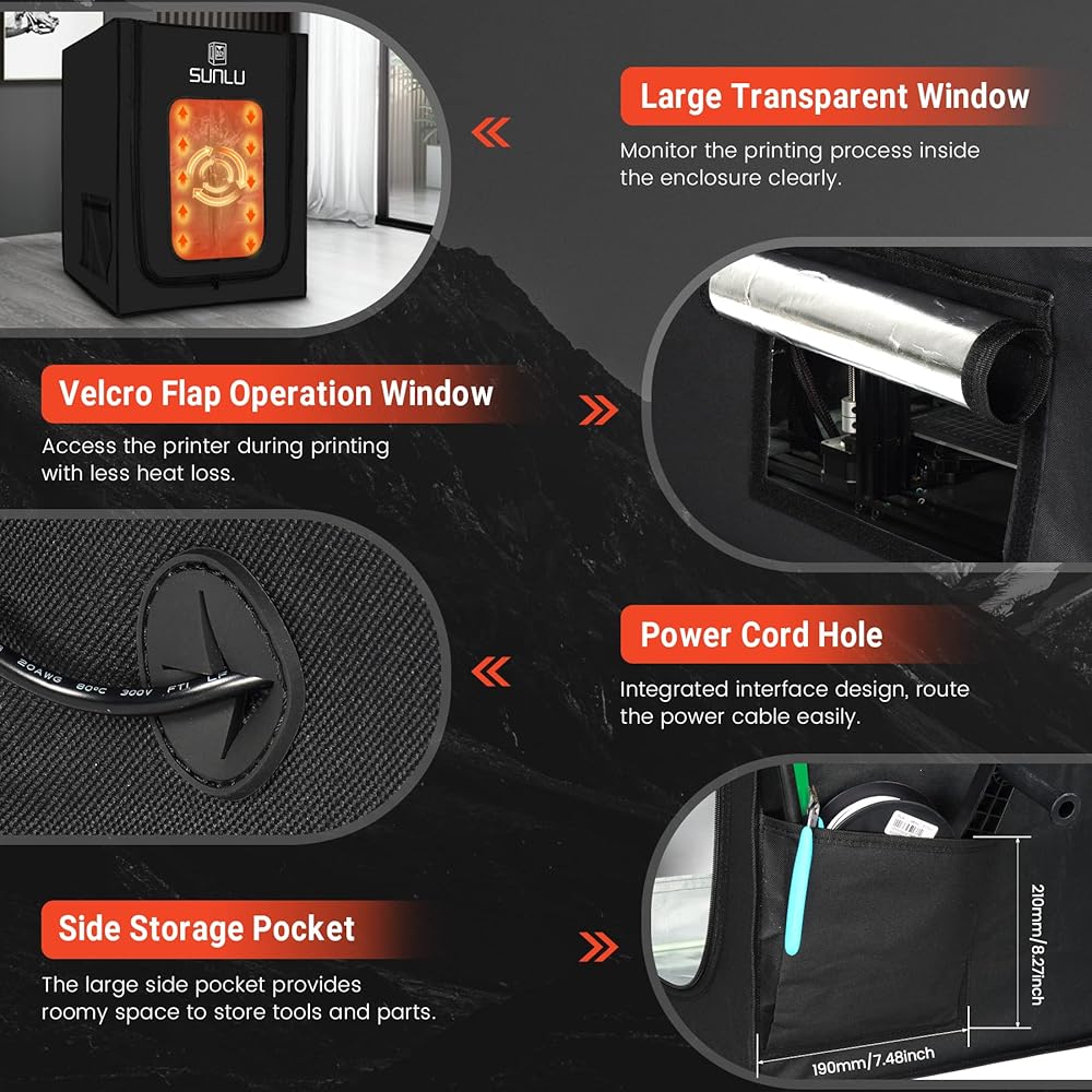 ④ 【تصميم سهل الاستخدام 】 تحتوي حاوية الطابعة SUNLU ثلاثية الأبعاد على نافذة عرض مرئية تسمح لك بمراقبة عملية الطباعة ثلاثية الأبعاد. يوجد على الجانب الأيسر جيب تخزين مقاس 8.27 بوصة × 7.48 بوصة لأدوات وملحقات الطابعة ثلاثية الأبعاد. يوجد على الجانب الأيمن نافذة تشغيل قابلة للطي من الفيلكرو تسمح بالوصول إلى الطابعة ثلاثية الأبعاد مع فقدان أقل للحرارة.