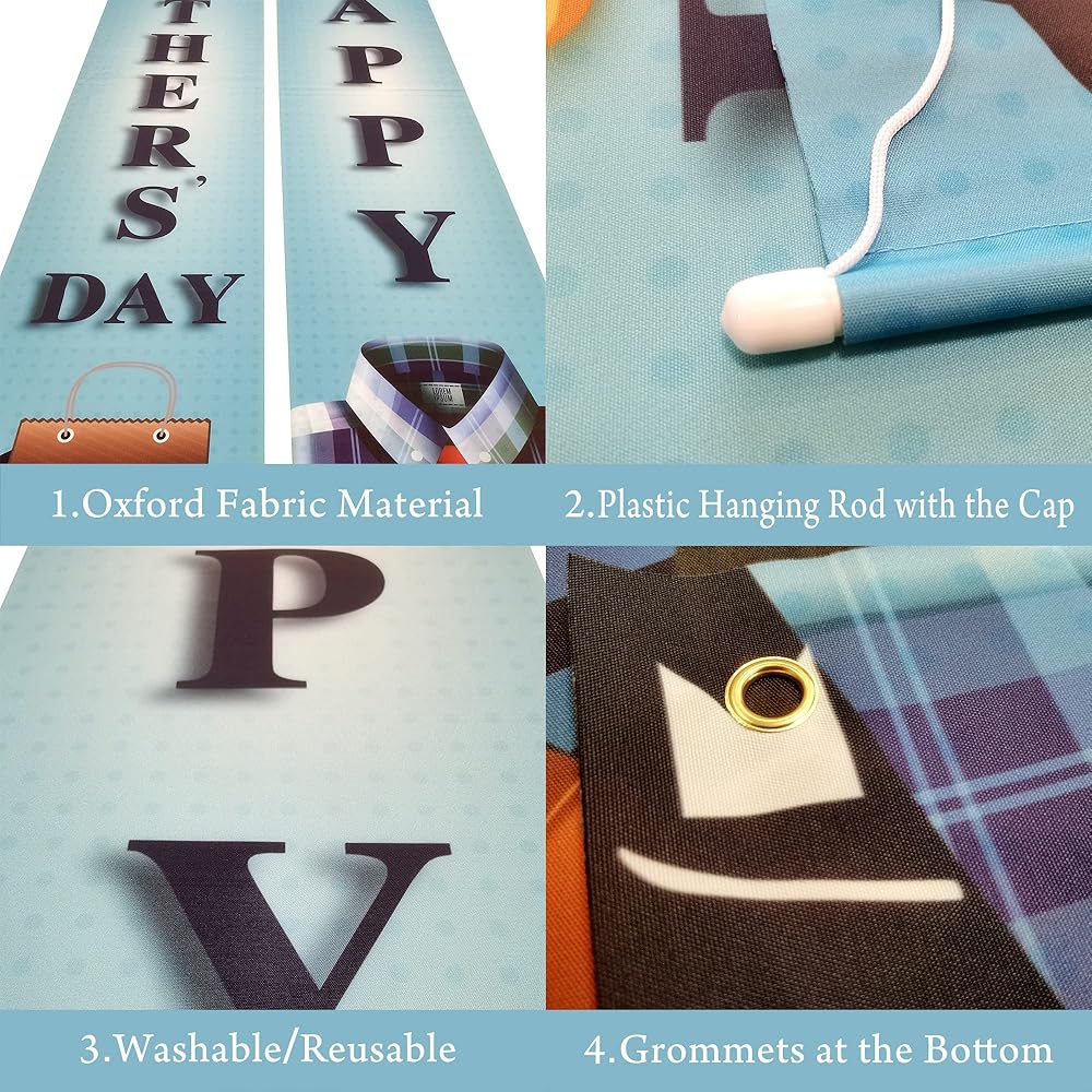 • قابلة لإعادة الاستخدام | نسيج أكسفورد قوي: خلفية لافتة عيد الأب هذه لديكورات عيد الأب تحتوي على قضيب تعليق في الأعلى. لافتة عيد الأب قابلة لإعادة الاستخدام، وهي مصنوعة من قماش أكسفورد القوي. حلقات نحاسية في الزوايا السفلية لخلفية عيد الأب السعيد ولفة من الشريط في العبوة. يمكنك استخدام لوازم حفلات عيد الأب هذه حتى في العام التالي. خلفية عيد الأب مصنوعة من مادة نسيج أكسفورد الناعمة ومقاومة للماء.