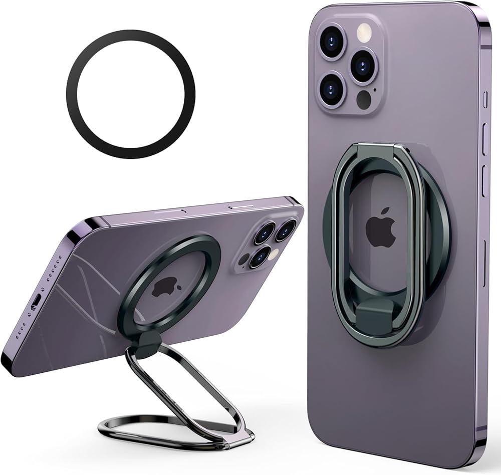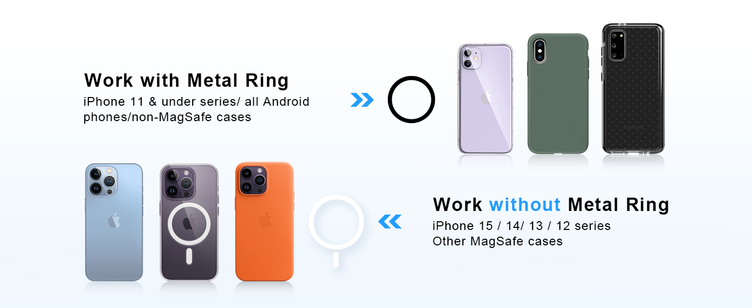 【يعمل لجميع الهواتف】* متوافق مع سلسلة iPhone 15/14/13/12 مع حافظة MagSafe أو بدون حافظة. * متوافق مع جميع الهواتف: نقدم حلقة معدنية إضافية واحدة تناسب الحافظة والهواتف الأخرى التي لا تحتوي على MagSafe.