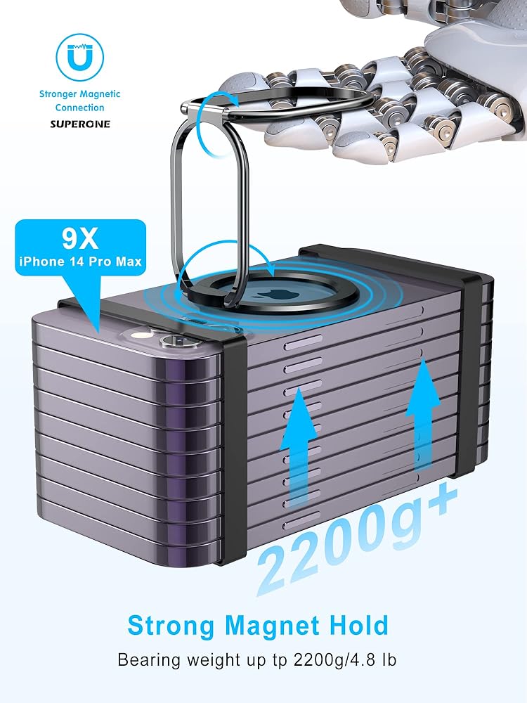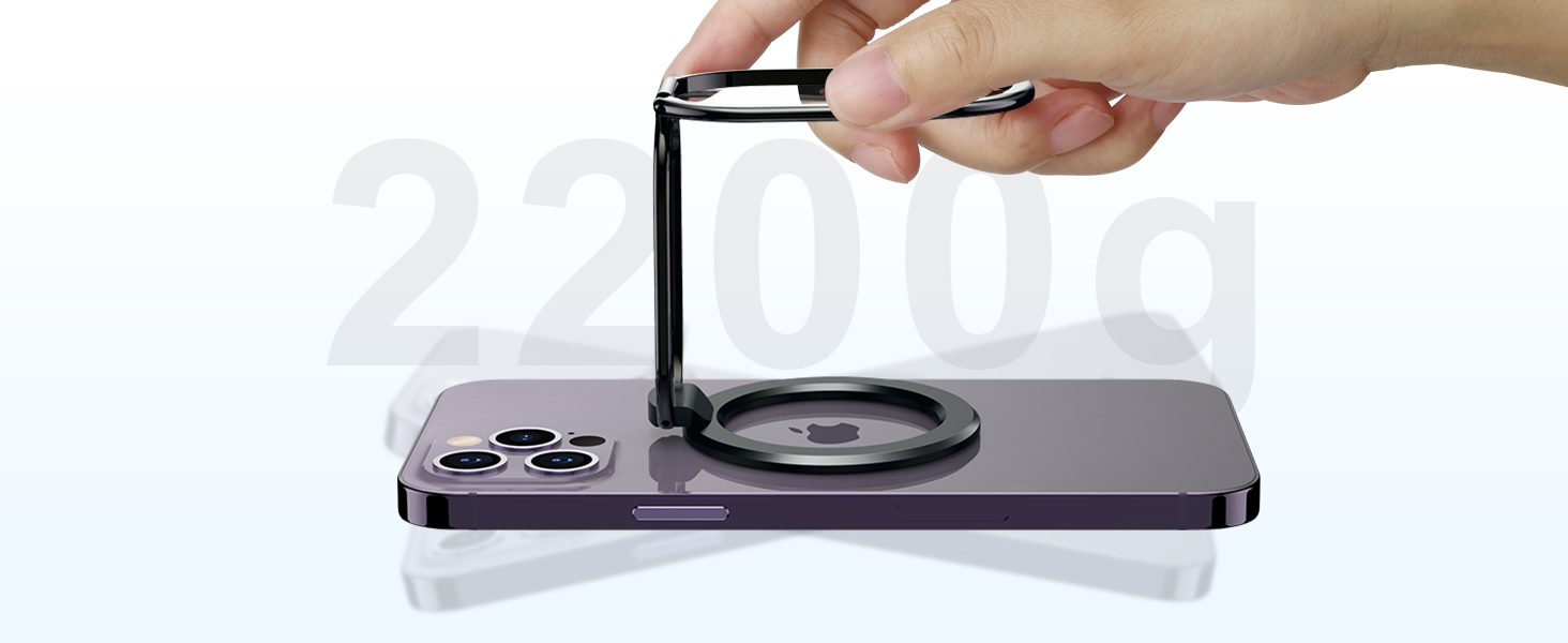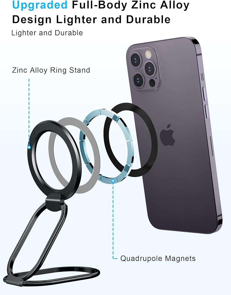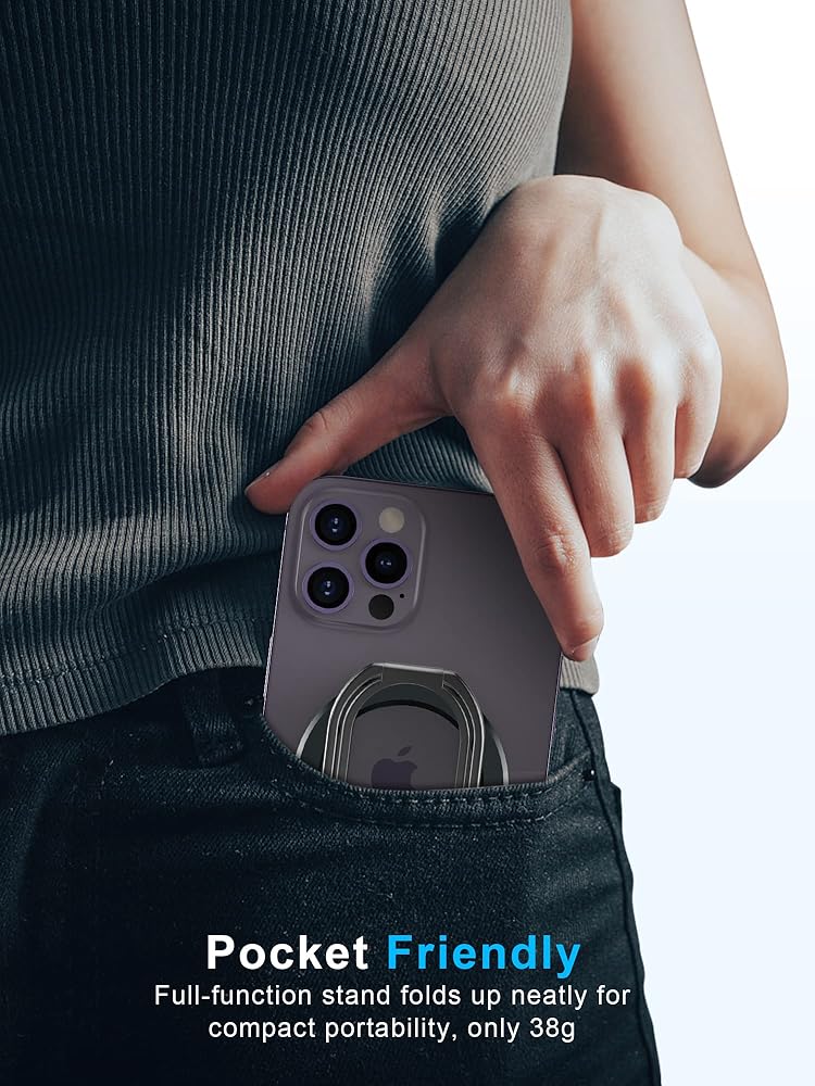 【رقم 1 مغناطيس قوي】حامل حلقة MagSafe الخاص بنا بقوة مغناطيسية تصل إلى 4.8 رطل (2.2 كجم)، أي ما يعادل وزن 9 iPhone 14 Pro Max. تأكد من التصاقه بإحكام بسلسلة iPhone 15/14/13/12.