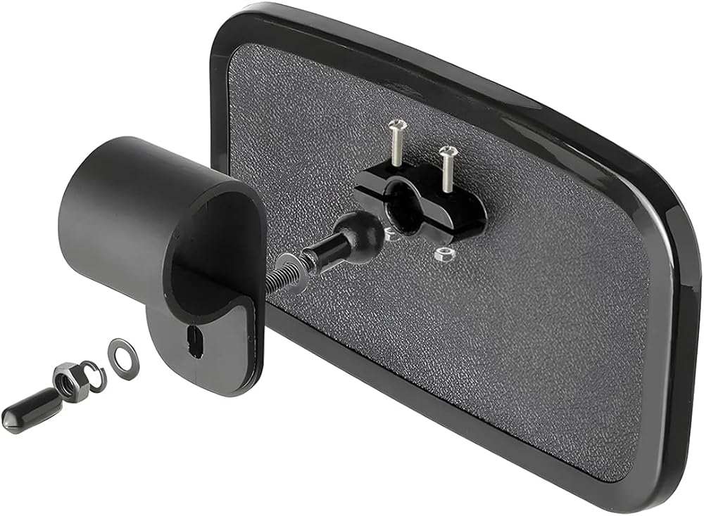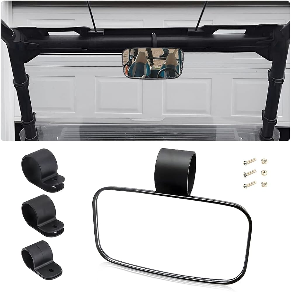 - Product includes mirror, three clips and other hardware, universal fit, universal UTV rear view mirror, extra large lens size, 4.5" high and 8" wide.