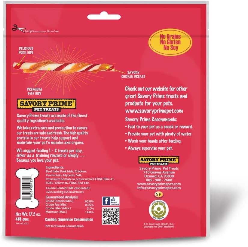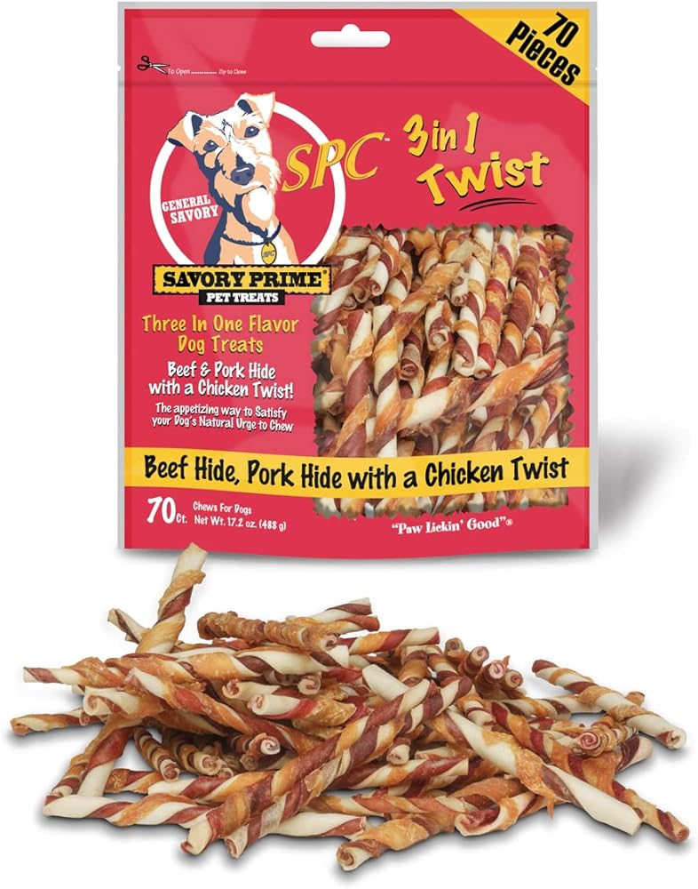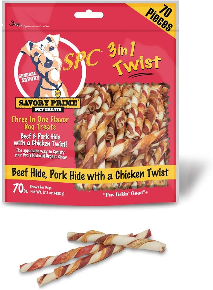 Three flavors in one savory dog treat, including premium beef and pork hides with real chicken wrapped, together to make an appetizing way to satisfy your dogs natural urge to chew.