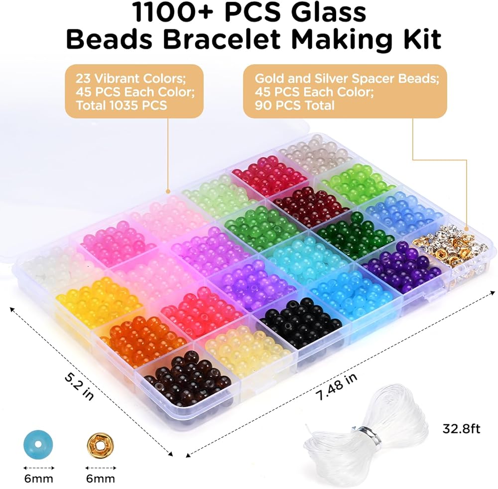 1100 قطعة من الخرز الزجاجي 6 مم من Yelofesh لصنع المجوهرات، 24 لونًا نابضًا بالحياة من الخرز الزجاجي المستدير الكريستالي للأساور، مجموعات كاملة لصنع الأساور للفتيات DIY الحرف اليدوية وأساور الصداقة