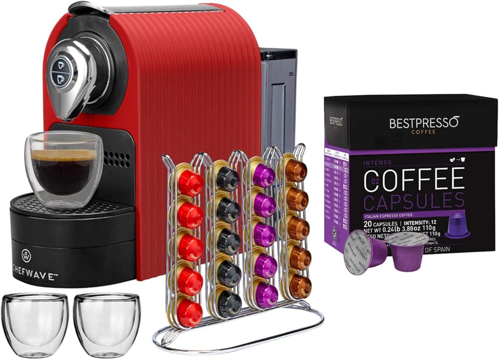 ماكينة إسبرسو صغيرة من شيف ويف متوافقة مع كبسولات نسبريسو (حمراء) مع خزان مياه قابل للبرمجة بلمسة واحدة مع حامل للكبسولات، 2 كوب زجاجي مزدوج الجدار و20 كبسولة قهوة بيستبريسو إنتينسو