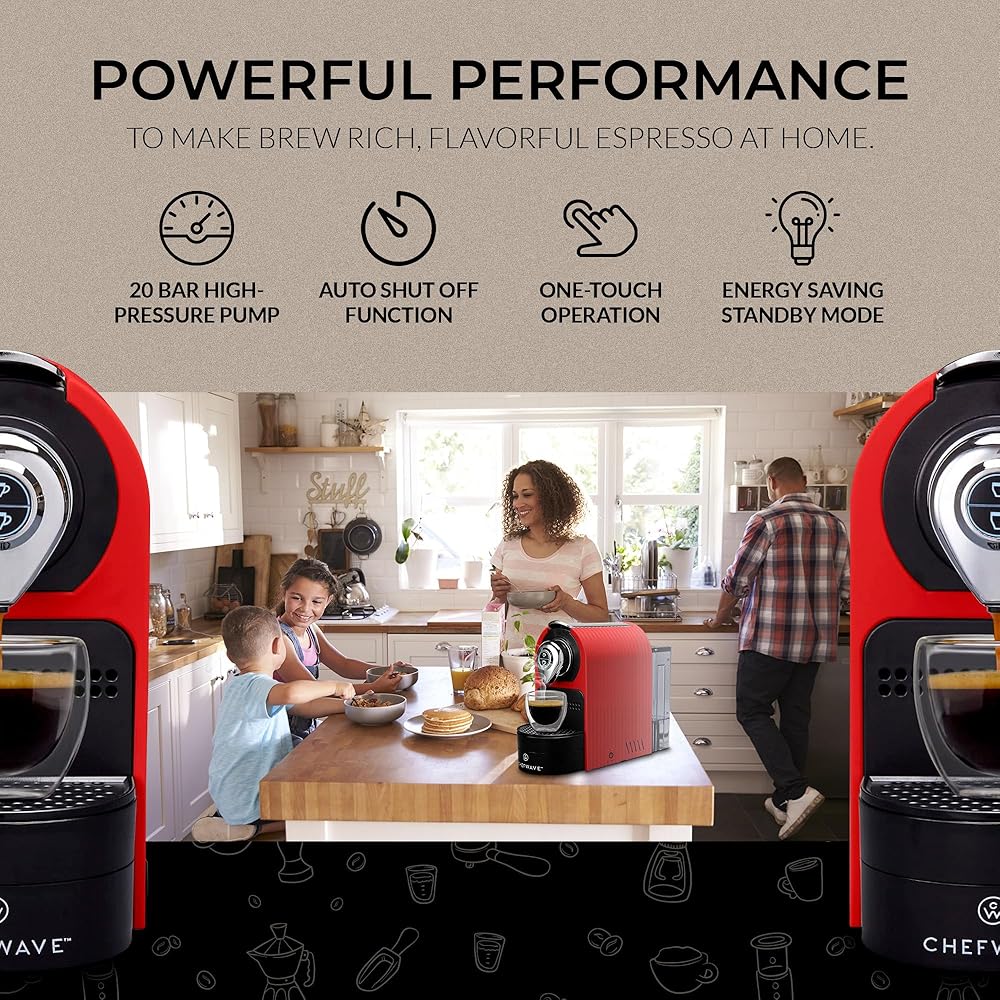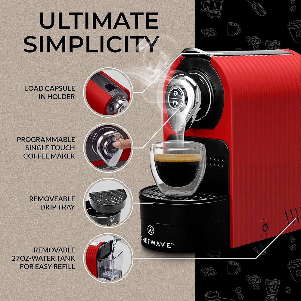 ChefWave Mini Espresso Machine for Nespresso Compatible Capsule with Holder and Cups (Red)