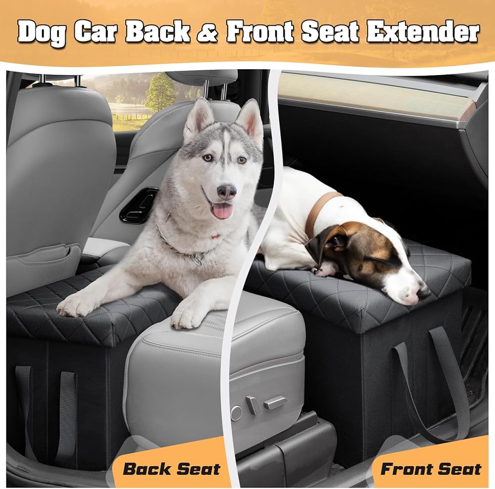 موسع مقعد السيارة للكلاب مع مساحة تخزين: يوفر موسع المقعد الخلفي للكلاب مساحة أكبر بنسبة 20% لكلبك لراحة أقدامه أو رأسه عندما يستلقي كلبك في المقعد الأمامي أو الخلفي، مما يجعل حيوانك الأليف المحبوب أكثر راحة في الرحلات الطويلة. كما يمنع موسع مقعد السيارة كلبك من السقوط من المقاعد أثناء المنعطفات المفاجئة والتوقف السريع.