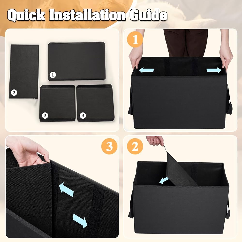 مساحة تخزين كبيرة جدًا: يبلغ حجم مساحة تخزين موسع مقعد الكلب 20.2 بوصة طول × 11.02 بوصة عرض × 14.7 بوصة ارتفاع، ويناسب معظم السيارات والشاحنات وسيارات الدفع الرباعي. يحتوي موسع مقعد الكلب على مساحة كبيرة لتخزين الهدايا الصغيرة والمقاود والألعاب وغيرها من مستلزمات الحيوانات الأليفة. يتضمن موسع مقعد الكلب مقسمين مع مثبتات بخطاف وحلقة لتلبية احتياجاتك. ويمكنك طيه بشكل مسطح لسهولة التخزين عند عدم الاستخدام.