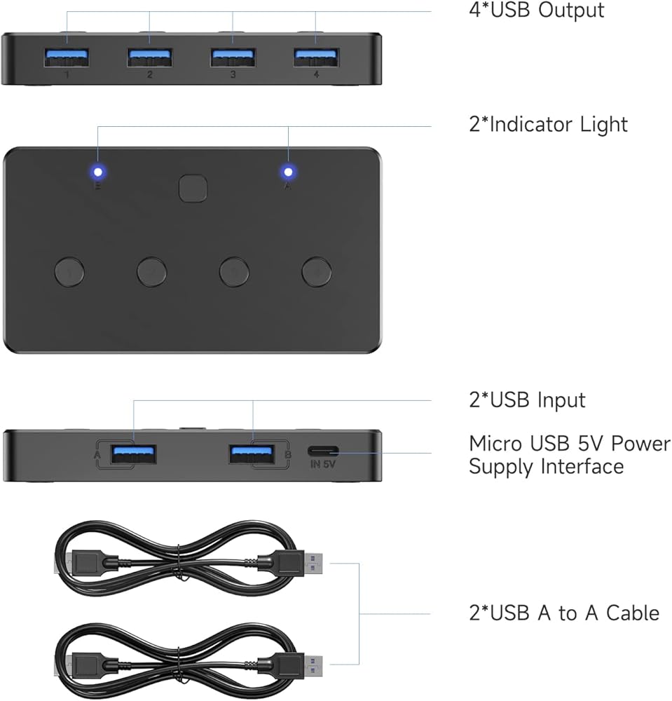 محول KVM، محول ACASIS USB 3.0 2 جهاز كمبيوتر يشارك 4 منافذ USB 3.0 A للماوس ولوحة المفاتيح والطابعة والمزيد، محول USB متوافق مع Mac/Windows/Linux مع كابلين USB 3.0