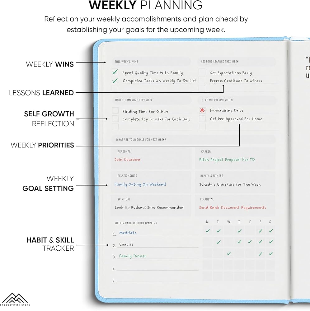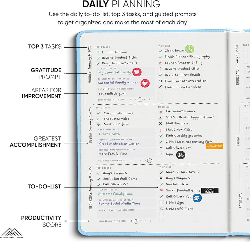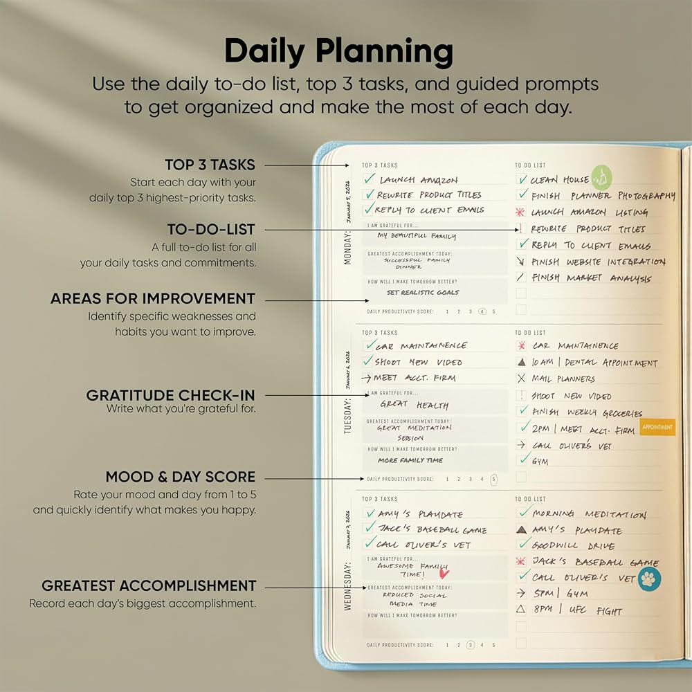 التخطيط والتتبع والانعكاس - نظام تخطيط يومي فعال لعام 2024 مكتمل بمهام "أفضل 3" وقائمة المهام ومطالبات التأمل ومتتبع الحالة المزاجية اليومي. مخطط يومي مثالي 2024-2025 لتحقيق أقصى استفادة من كل يوم. مخطط يومي مثالي 2024-2025 لتحقيق أقصى استفادة من كل عام.