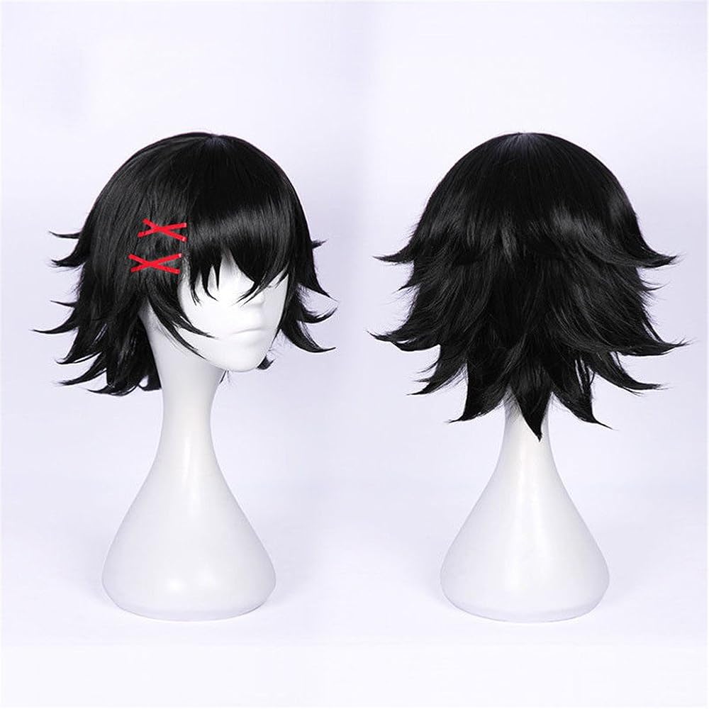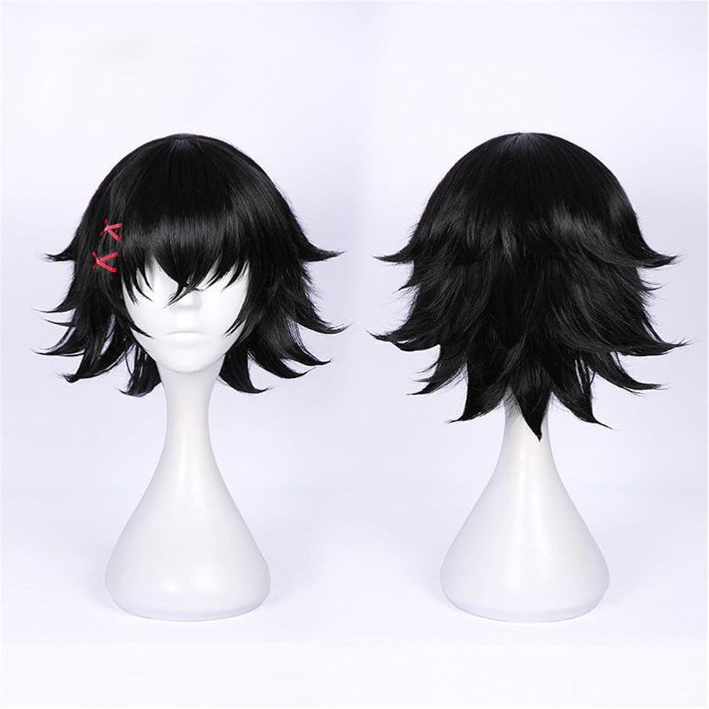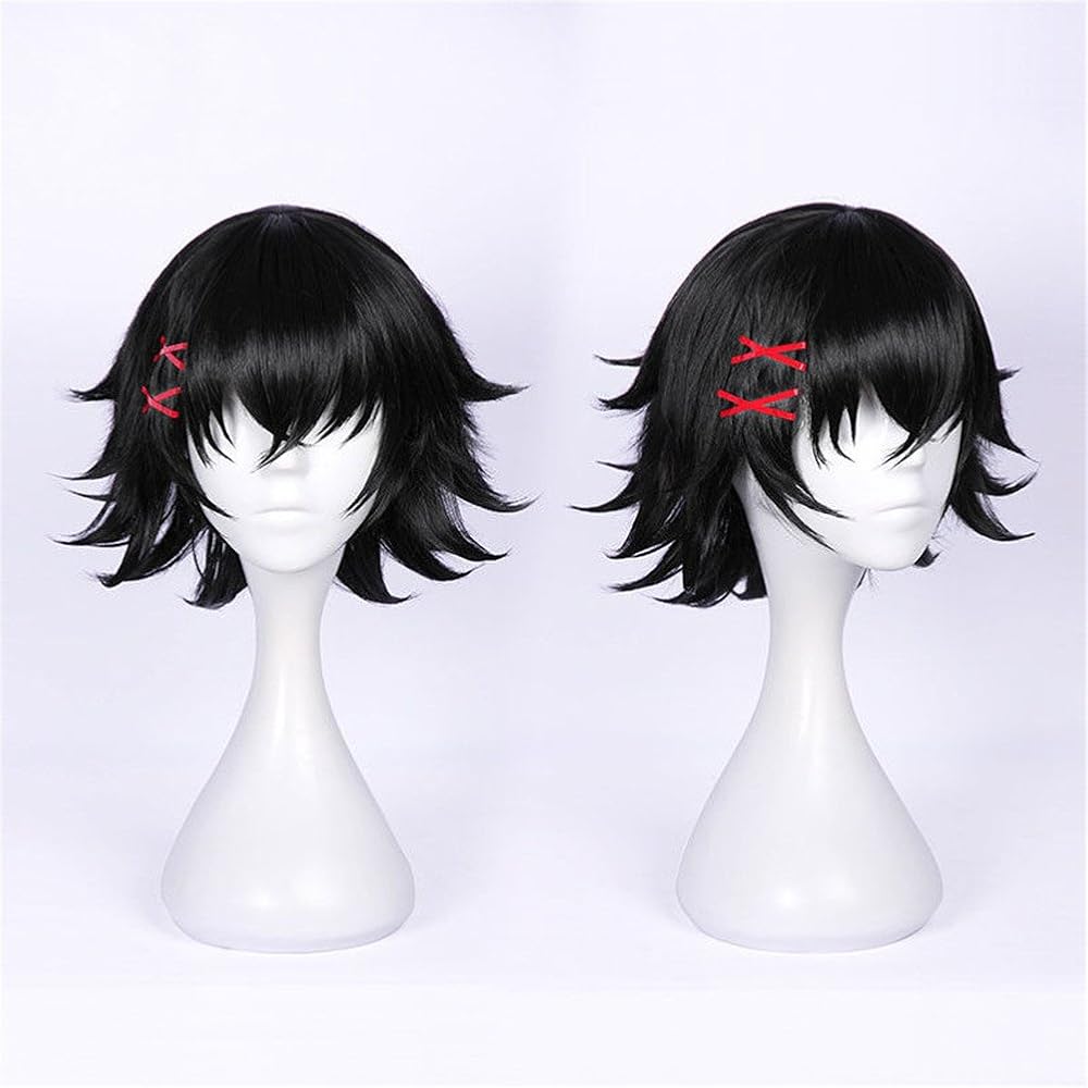 أنيمي شعر مستعار أسود قصير مع دبوس شعر أحمر للنساء للحفلات