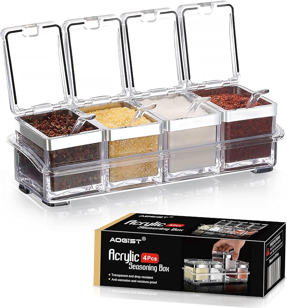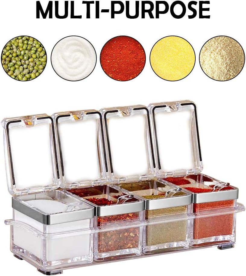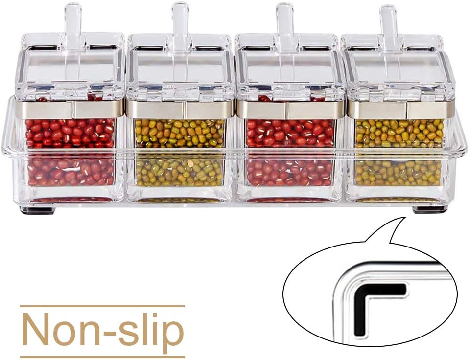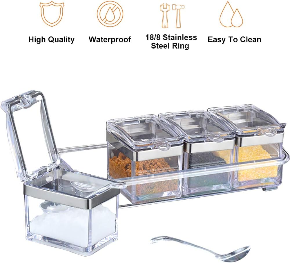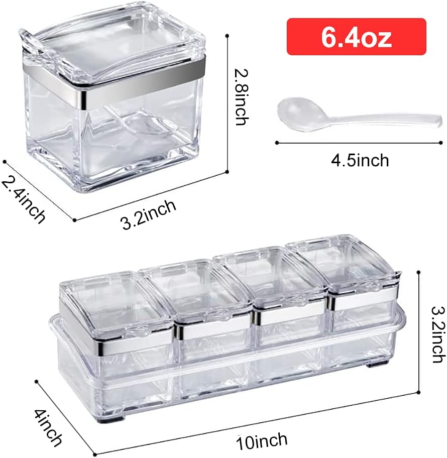 *مادة عالية الجودة: مصنوعة من مادة أكريليك عالية الجودة وحلقة من الفولاذ المقاوم للصدأ حول كل وعاء، متينة وسهلة التنظيف. موزعات التوابل في المقصورة، وأختام سوداء غير قابلة للانزلاق في الزوايا الأربع للصينية وحول جميع الأغطية.