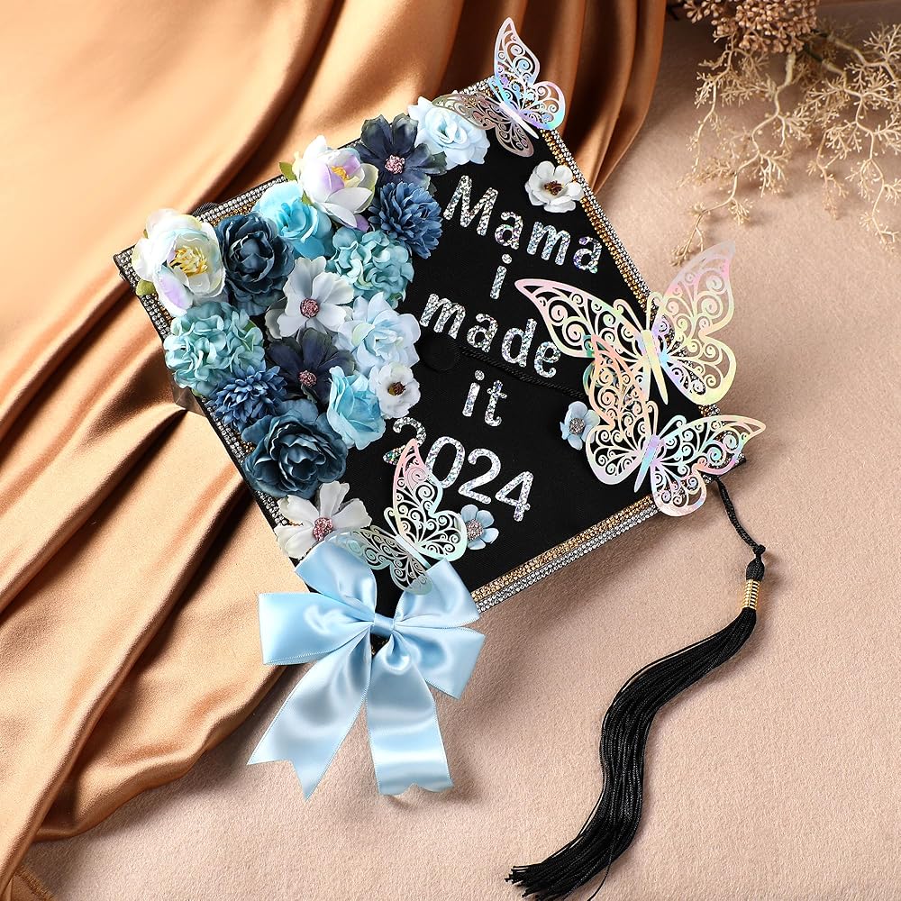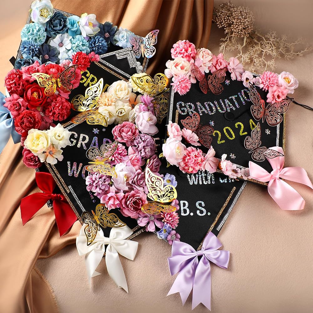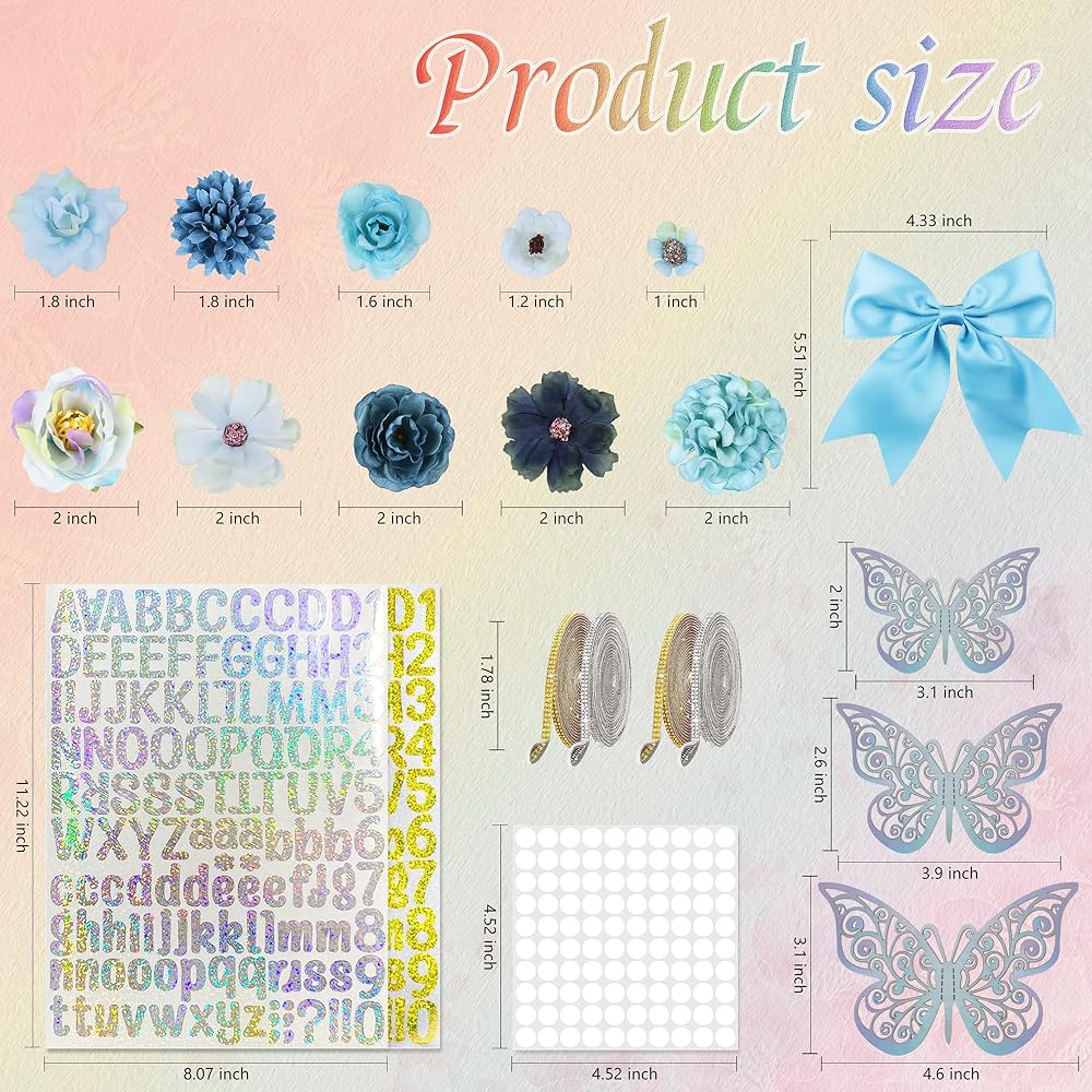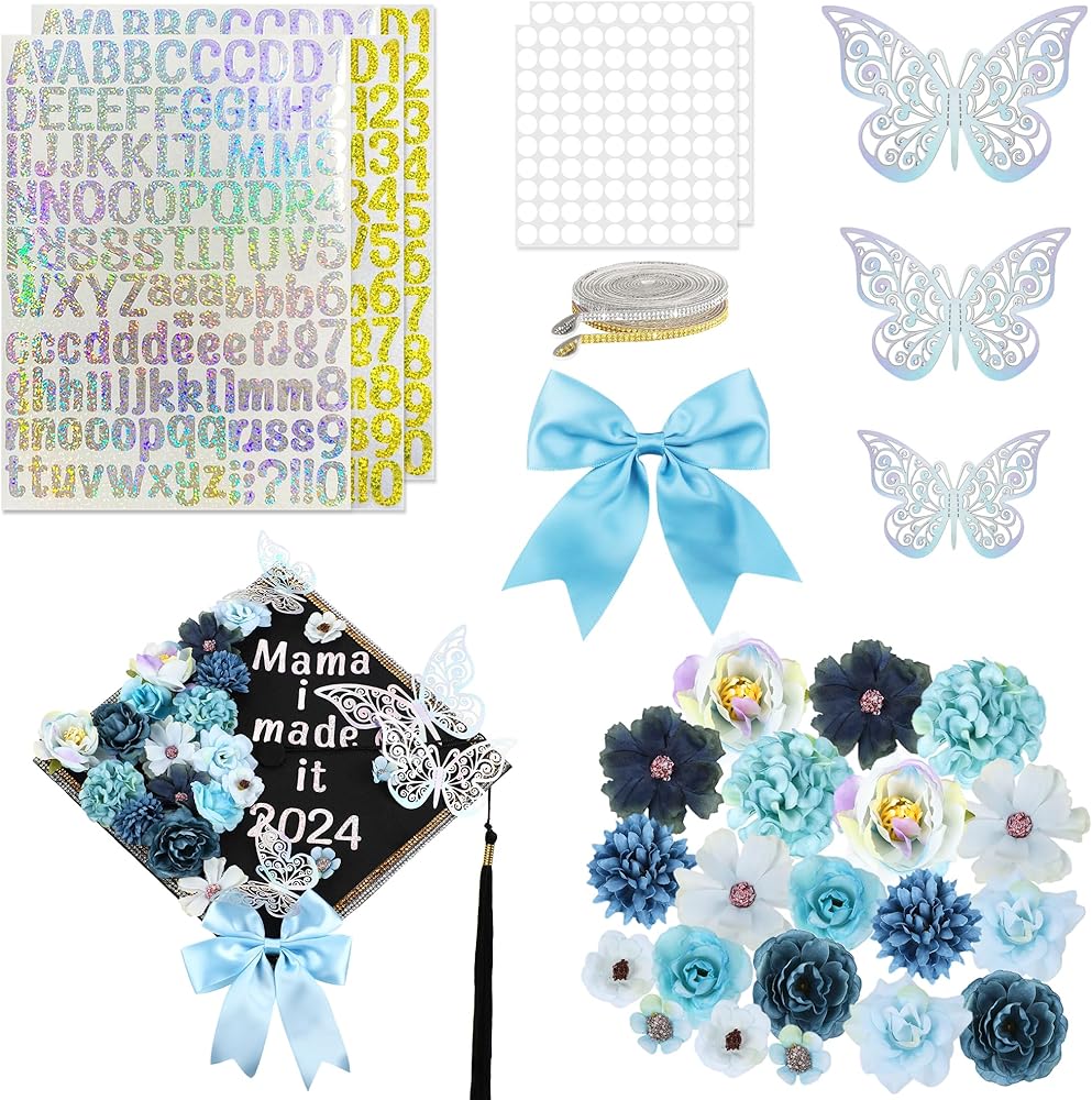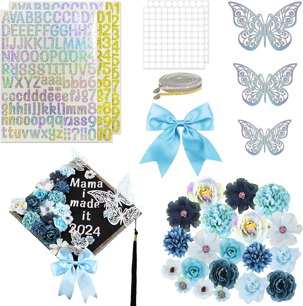مواد ديكور متنوعة: قطعة واحدة من قبعة التخرج (بطانة من الورق المقوى)، قطعة واحدة من عبوة مواد الزهور، قطعتان من ملصقات الحروف والأرقام الذهبية بالليزر بنقطة كريستال A4، قطعتان من ملصقات الحروف والأرقام الفضية بالليزر بنقطة كريستال A4 2، قطعة واحدة من أحجار الراين الذهبية، قطعة واحدة من أحجار الراين الفضية، قطعتان 0.5 ملصقات نانو مم 100 قطعة، قطعة واحدة من القوس الوردي بحافة ذهبية، قطعتان من ملصقات الفراشة.