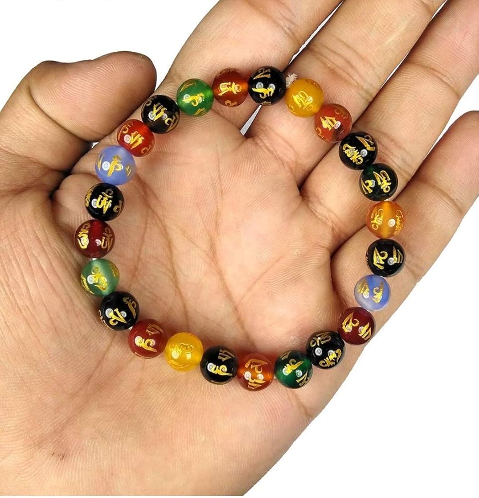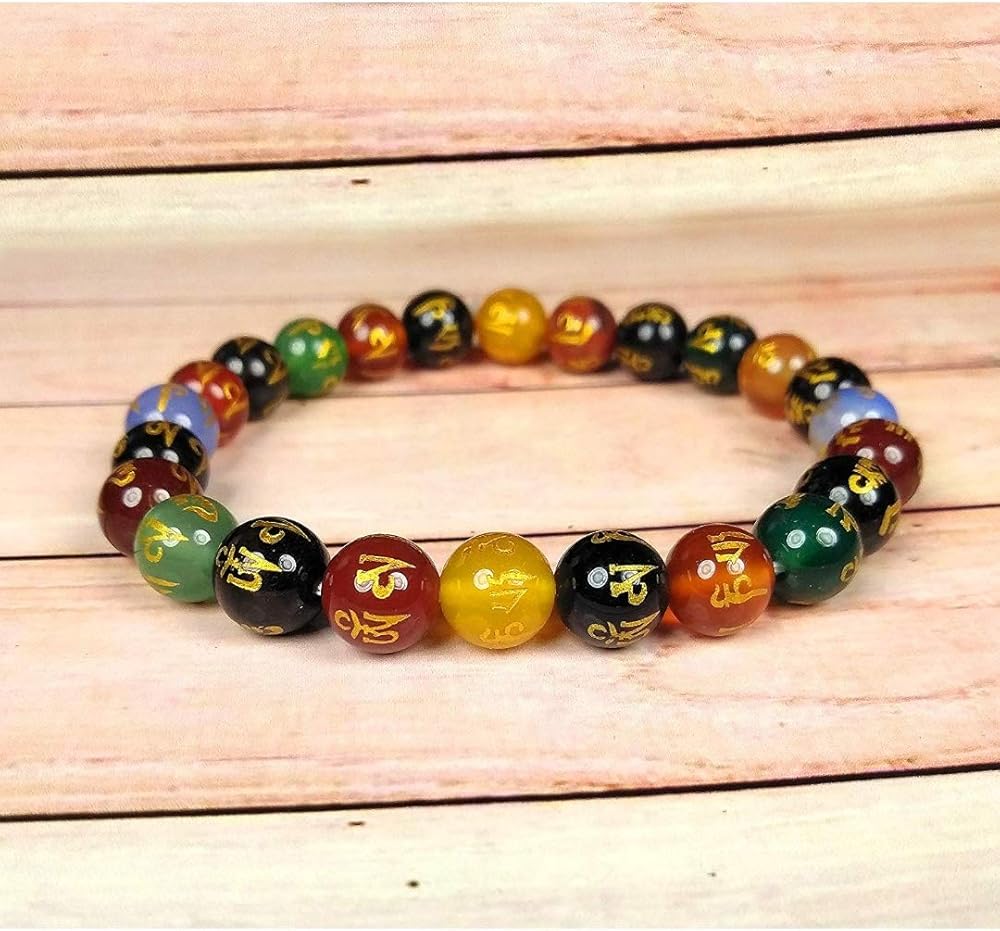 هذا سوار مالا من الخرز الحجري الرائع.. وهو عبارة عن خرزة من العقيق مغلفة بكتابة ذهبية اللون. الكتابة هي شخصيات التبتية وتبدو مذهلة. الكتابة على الخرزة تقول "أوم ماني بادمي هوم" وهو شعار بوذي مشهور جدًا.