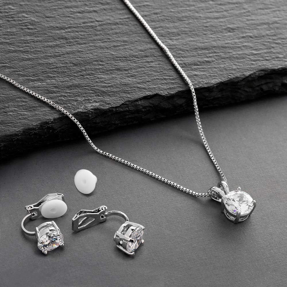 Good things come in small packages and this Mariell necklace and earrings set is no exception. The gleaming 2 Ct. CZ pendant and matching clip on earrings have the unmistakable look of delicate diamond jewelry at a fraction of the cost. The genuine silver Platinum-plated necklace features a brilliant 2 Carat round-cut Cubic Zirconia solitaire (8mm) suspended from an adjustable 16" - 18" box chain. The round CZ has a lovely 4-pronged setting with a simple split-bale finding. The accompanying non-pierced clip earrings feature removable disc pad inserts for all-day comfort. With it's genuine Platinum plating and Cubic Zirconia, this CZ necklace pendant set can be worn everyday like fine diamond jewelry. Whether buying this beautiful necklace ensemble for yourself or for that "someone special, this jewelry classic will be enjoyed for years to come thanks to its brilliant precision-cut solitaire, scratch-resistant platingand no-tarnish finish. We love the "dress-up" or "dress-down" versatility of this dainty pendant set. This delicate stunner is a wearing favorite for brides and for bridesmaid's gift. It's a top choice for affordable wedding party gifts and is the perfect gift for birthdays, holidays, Mother's Day, Valentine's Day, anniversaries, Christmas and special occasions. Wear this gorgeous pendant everyday the same way you'd wear genuine diamonds. Nobody but you will know this CZ necklace set is not fine jewelry. So whether you're wearing this down the aisle, jazzing up a night on the town or adding a touch of sparkle to your business suit or a holiday sweater - you'll fall in love with this versatile "go-to" fashion favorite. Treat yourself or someone you love to the gift of some sophisticated diamond-like sparkle.