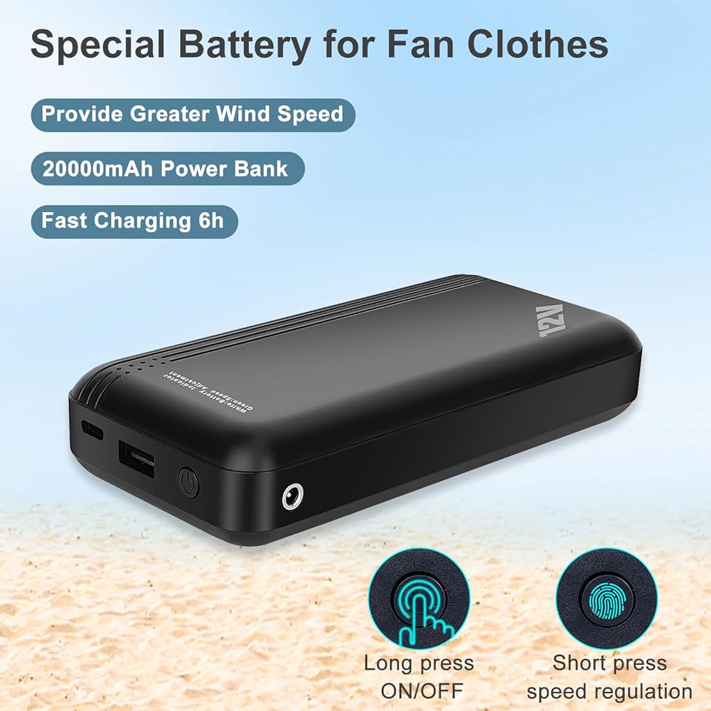 متضمنة مع بطارية 12 فولت: سترة مروحة Foiueyga مع حزمة بطارية 20000 مللي أمبير في الساعة. قوة عالية، سعة كبيرة. تضمن البطارية المحددة أن تكون مروحة سترة التبريد عالية الأداء والكفاءة، وبطارية أطول تستخدم الوقت، وشحن آمن واستهلاك أقل للطاقة. عندما تكون في الوضع العالي، تعمل المروحة الكهربائية لفترة طويلة تصل إلى 12 ساعة.