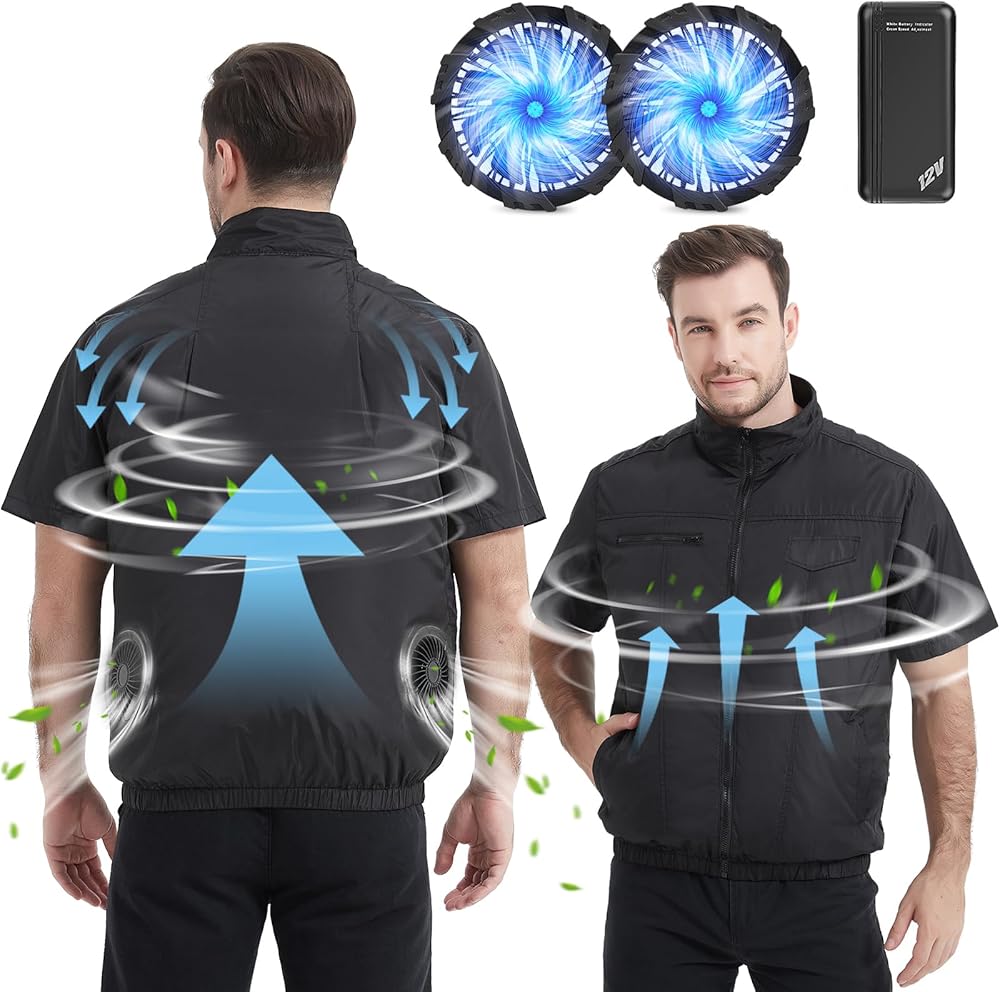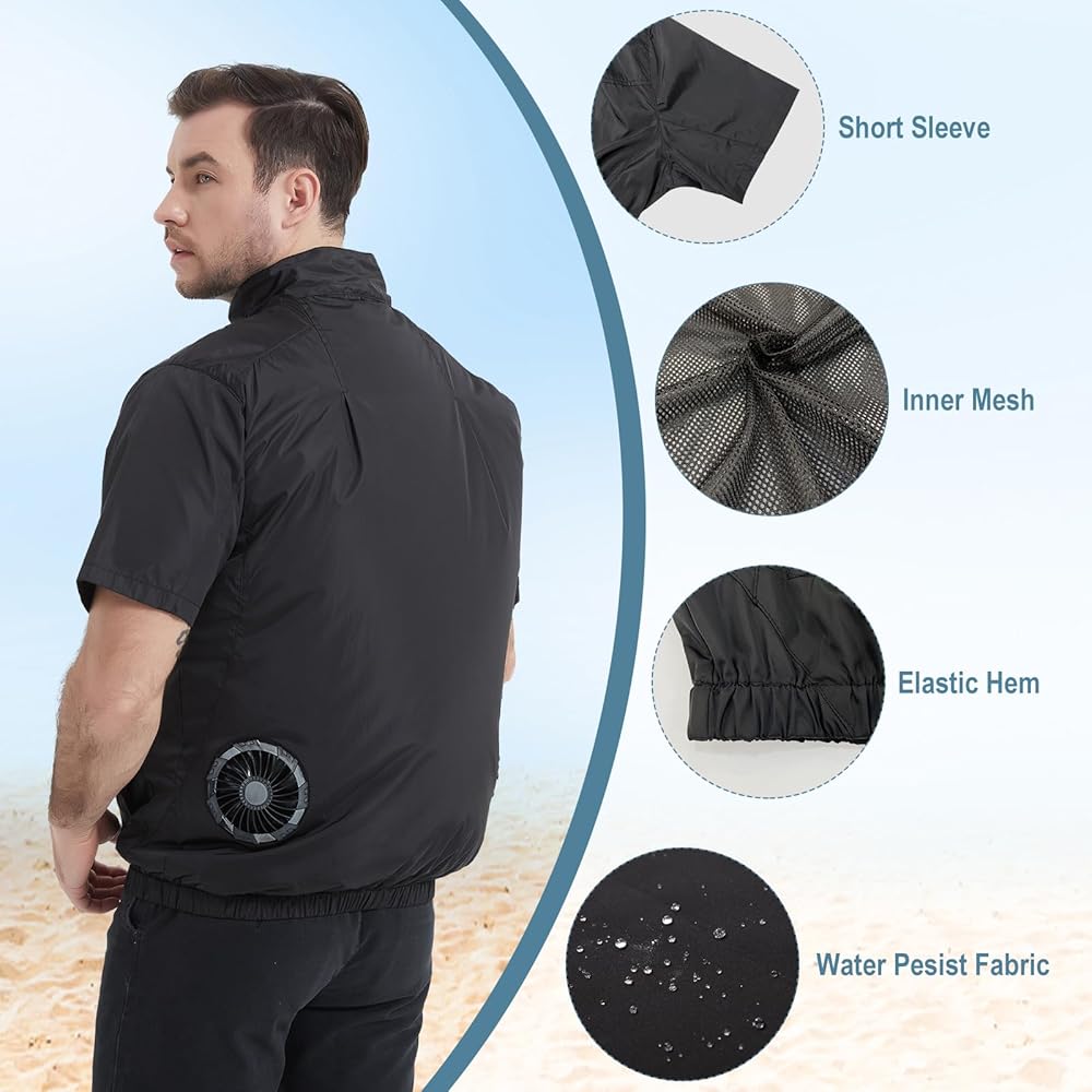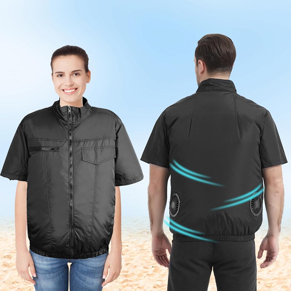 ما هي الملابس مكيف الهواء؟ تتكون سترة التبريد من سترة سوداء قصيرة الأكمام ومروحتين DC. توفير الطاقة من خلال مصدر طاقة البطارية لدفع الدوران السريع للمروحة. تجعلك تشعر بالانتعاش والراحة في مكان حار.