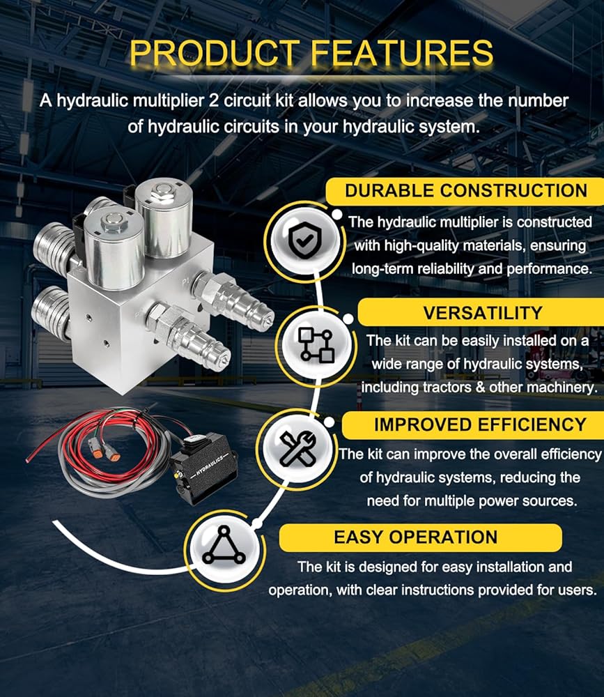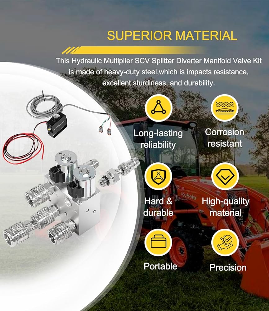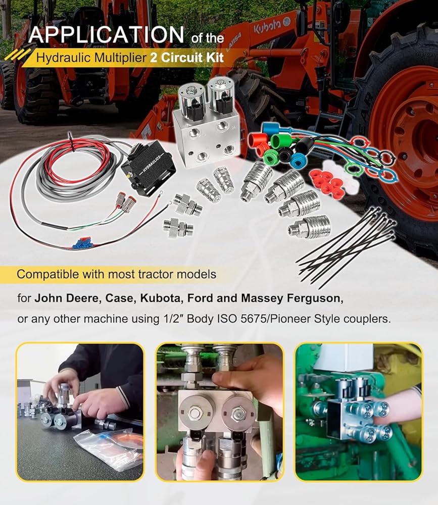 【VARIOUS APPLICATION】This Hydraulic Multiplier Kit Compatible with most tractor models, compatible with John Deere, Case, Kubota, for Ford and Massey Ferguson, or applicable for machine using 1/2″ Body ISO 5675/Pioneer Style couplers. Capacity for up to 20 GPM hydraulic flow Up to 3000 PSI hydraulic systems.