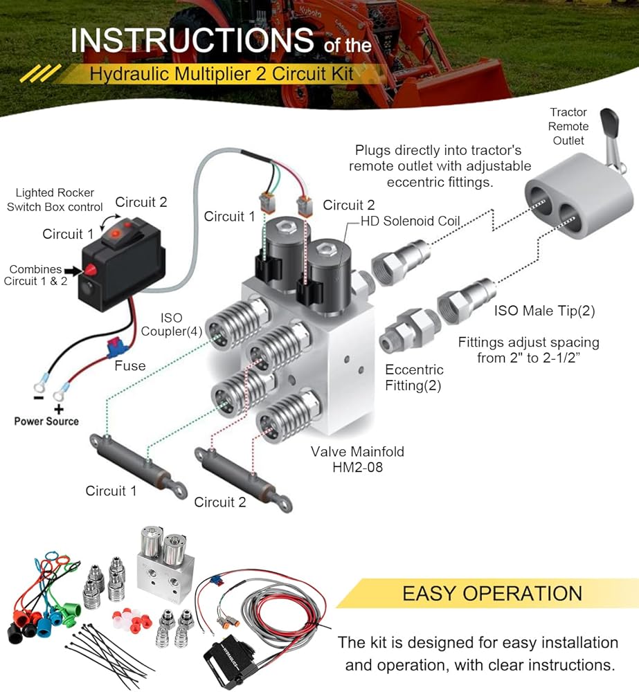 【SIMPLE PLUG-IN VALVE DESIGN】Offers quick and easy installation. Can plug directly into tractor's outlet with custom eccentric fittings adjustable to fit center-to-center dimensions from 2″-2.5″. The switch box control allows you to select circuits 1 and 2 separately or simultaneously.