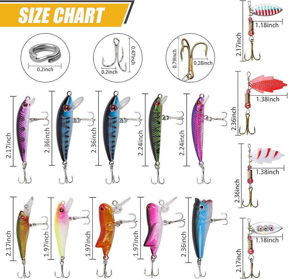 معلومات المقاس - 10 قطع من طُعم البلمة (الطول: 1.53 بوصة ~ 2.32 بوصة)؛ 10 قطع من الطُعم الذهني (الطول: 1.69 بوصة ~ 1.97 بوصة)؛ 10 قطع دوارة (الطول: 0.98 بوصة ~ 1.42 بوصة).