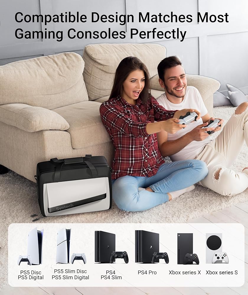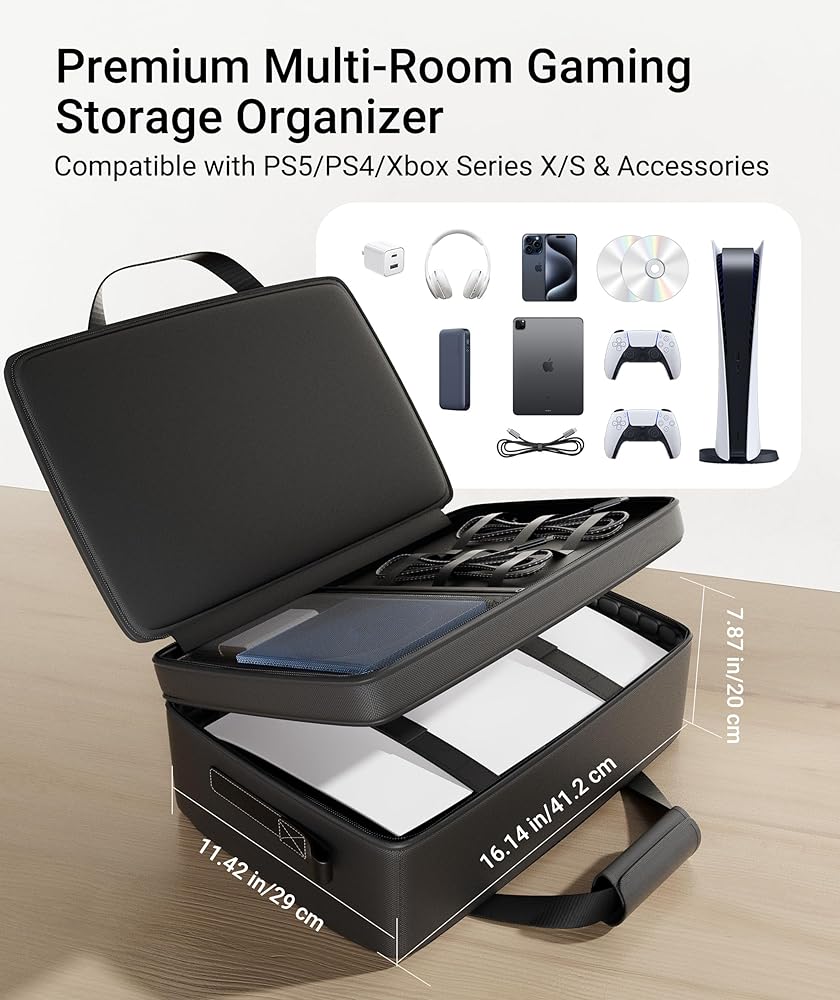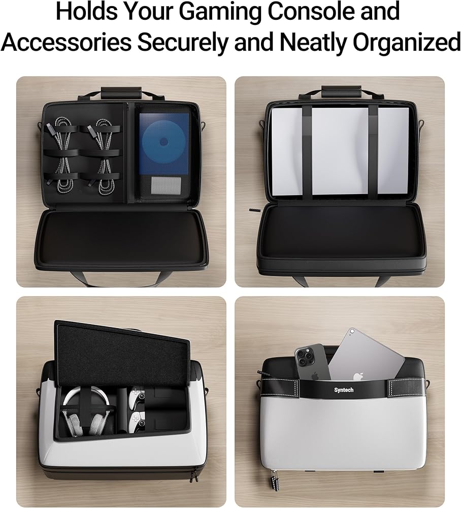 حقيبة حمل Syntech متوافقة مع وحدة تحكم PS5 Slim/Disc/الإصدار الرقمي، وسلسلة وملحقات PS4 Pro/Slim Xbox، وحقيبة تخزين واقية للسفر ذات سعة كبيرة لوحدات التحكم وسماعات الرأس والأقراص