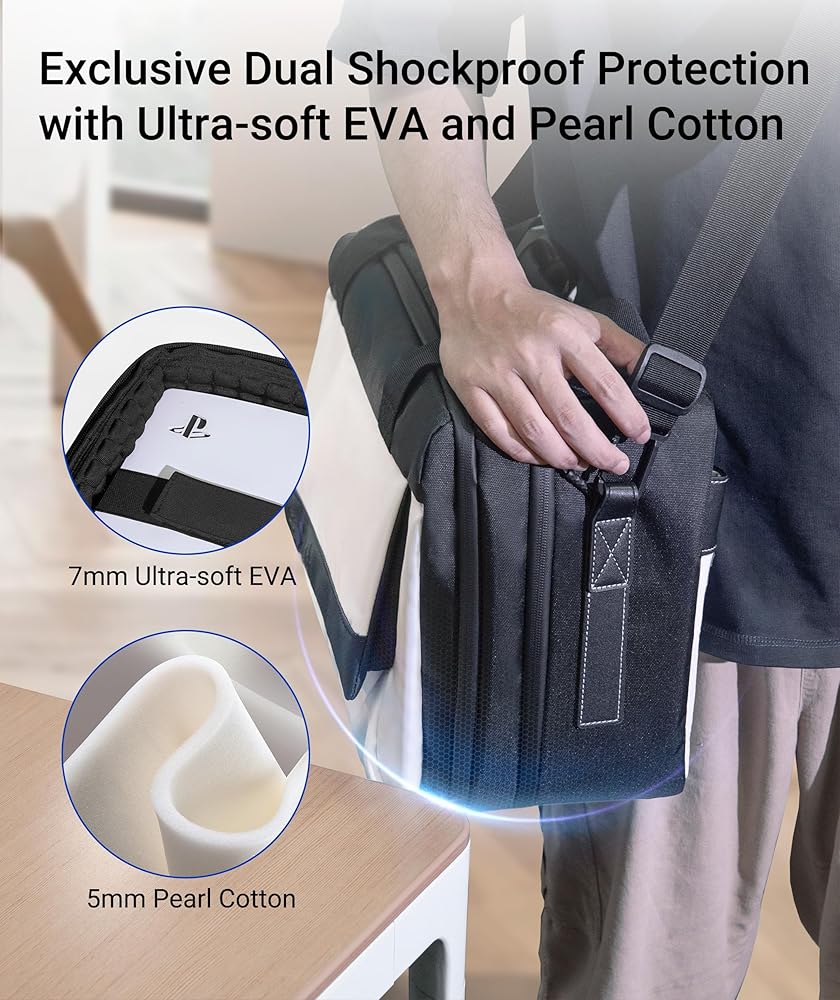 【تصميم تخزين مقسم】تتميز حقيبة حمل Syntech لجهاز PS5 بتصميمها المكون من أربع حجرات المصمم علميًا. تم تصميم كل حجرة في حقيبة الحمل خصيصًا لتخزين وحدات التحكم في الألعاب وأجهزة التحكم وسماعات الرأس والكابلات عالية الدقة وبطاقات الألعاب والملحقات والضروريات اليومية ومستلزمات السفر وما إلى ذلك بشكل آمن. تحافظ الحقيبة ذات السعة الكبيرة على كل شيء منظمًا.