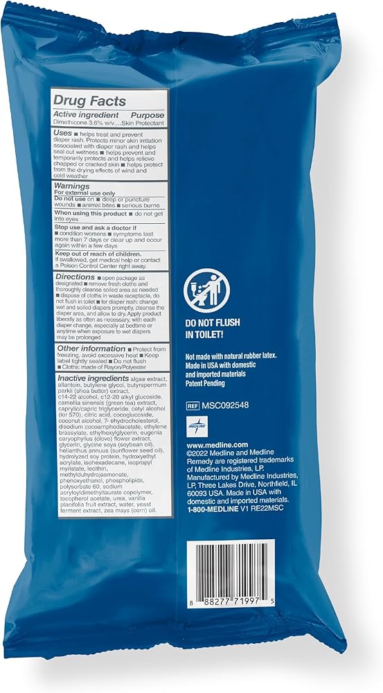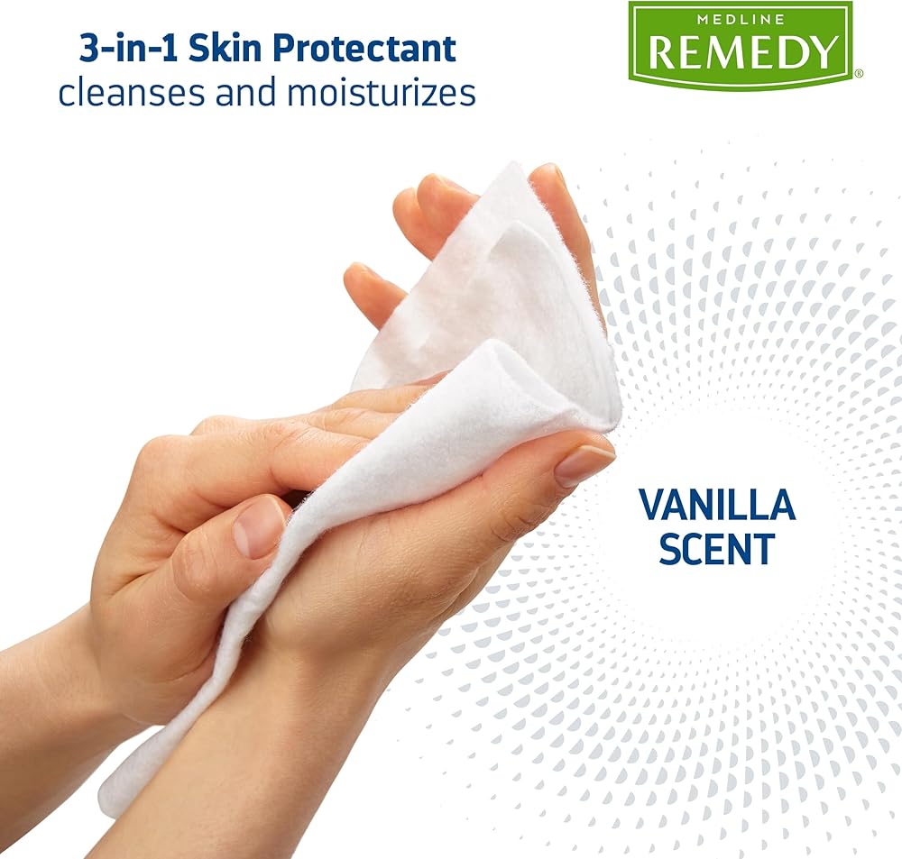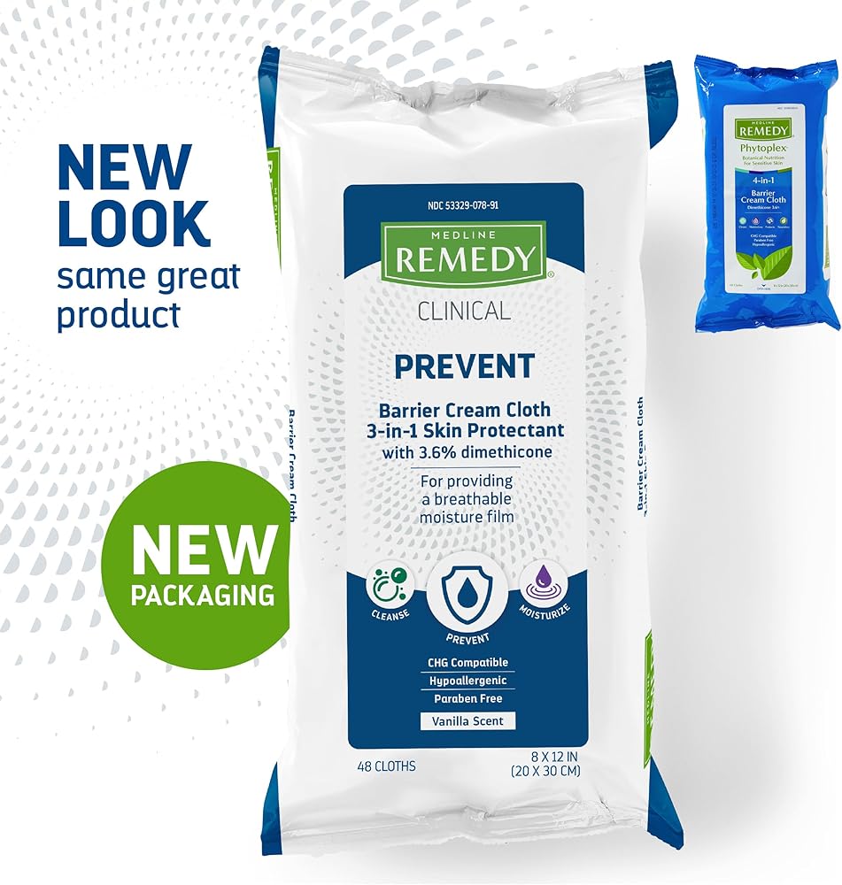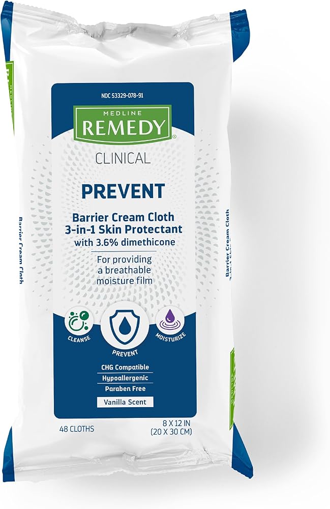 There are lots of cleansing wipes and cloths to choose from, but none with the convenience and multiple benefits of the Medline Remedy CLINICAL 3-in-1 Barrier Cream Cloth. It's the one ultra soft cloth that cleanses the most delicate skin, including the perineal area, while also moisturizing and leaving a smooth waterproof film to keep good moisture in, damaging wetness out. Use it as a total body wash to cleanse, condition and moisturize skin - without aggravating it. Natural phospholipid cleansing agents work on dirt, sweat - even urine and fecal matter - without removing skin's natural oils like harsh sulfate cleansers do. In fact, many women have started using these cloths as part of their everyday healthy skin routine. And with no rinsing, skin is left silky, clean, protected, and beautifully moisturized. Thoughtfully formulated with the gentlest ingredients, each premoistened cloth is hypoallergenic, pH balanced and non-irritating; with no parabens, aloe or phthalates. And they're CHG compatible so they're good for use by medical professionals who care for all types of patients. Even more skin support is provided by our proprietary Remedy Nutrient Complex (formerly Phytoplex), which includes nourishing botanicals, soothing antioxidants and natural oils, hydrators, moisturizers, emollients and humectants. These combine to deliver the finest all-around skin support for skin that is rough, dry, irritated, at-risk or damaged by wetness.As the country's #1 provider of skin care for healthcare, we're committed to quality care for hair and skin, including skin at risk due to age, environmental or medical conditions and everyday dryness. Experience quality skin care that goes beyond the ordinary with Remedy CLINICAL 3-in-1 Barrier Cloths.