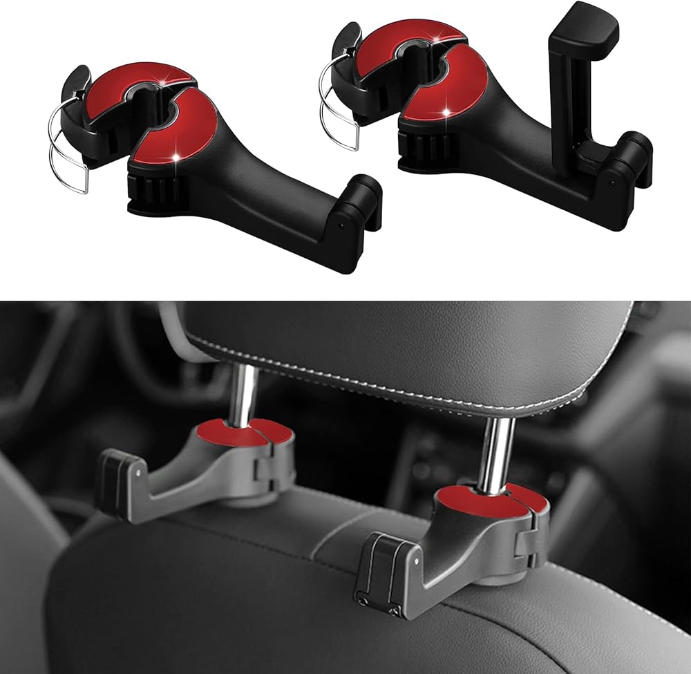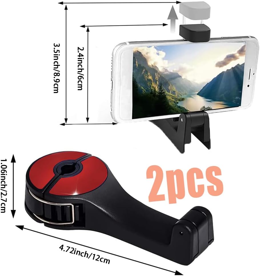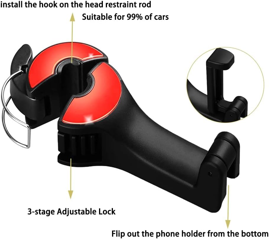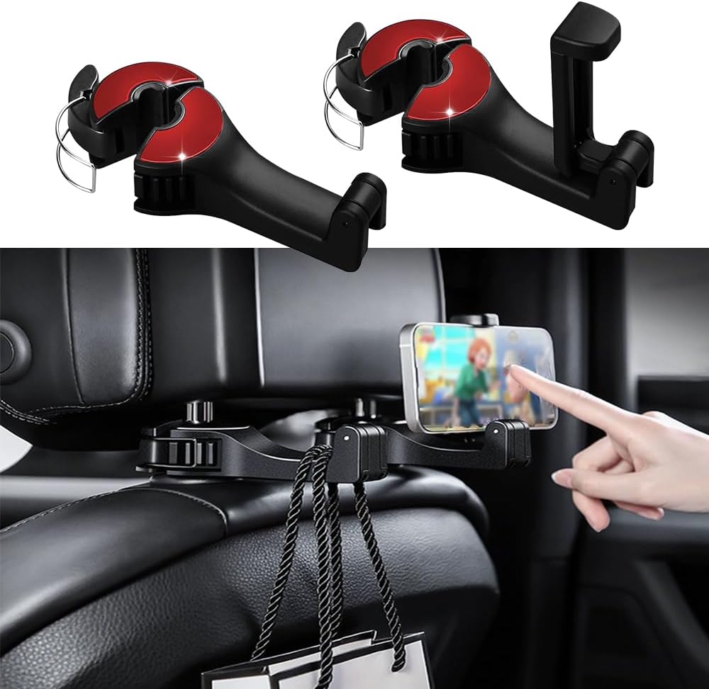 2 حزمة هوك مسند رأس السيارة مع حامل الهاتف، 2 في 1 سيارة المقعد الخلفي مسند الرأس حامل الهاتف المحمول شماعات حامل هوك لحقيبة محفظة القماش البقالة (أحمر)