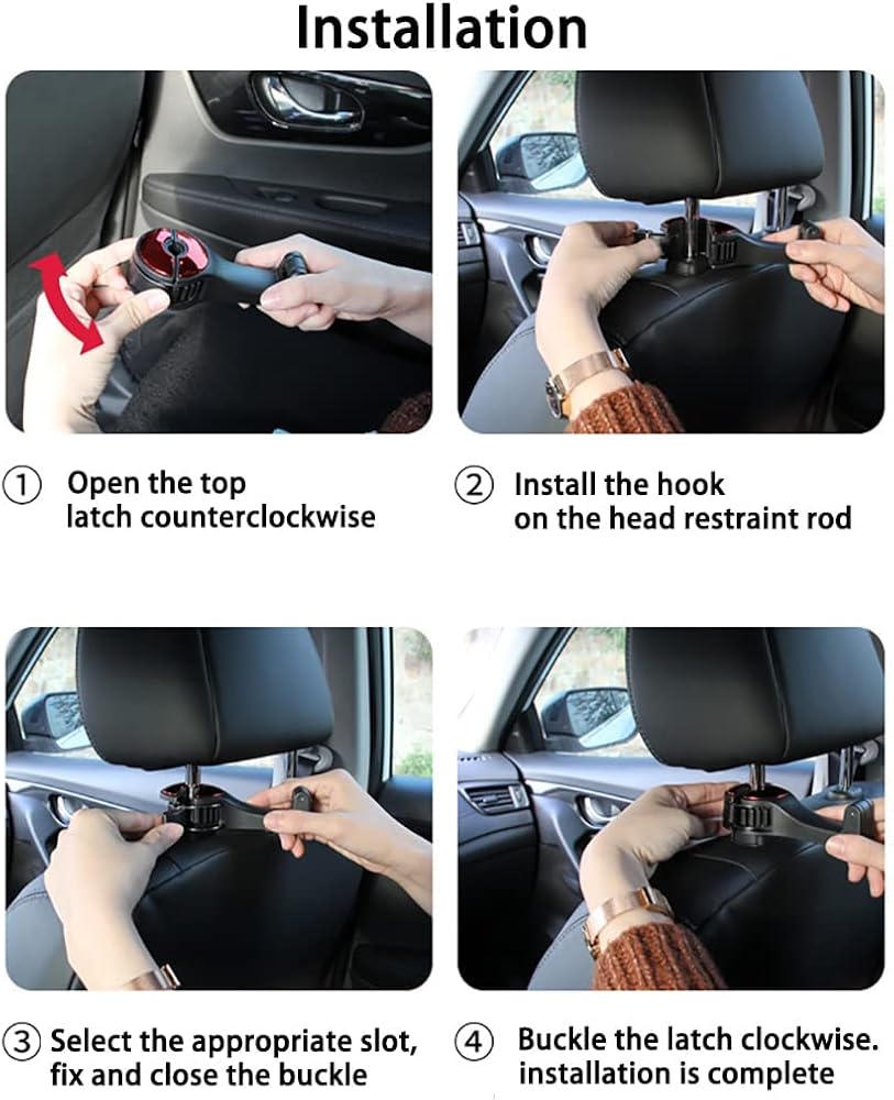 [استخدام المنتج]: الخطوة 1-افصل المزلاج العلوي عكس اتجاه عقارب الساعة. الخطوة 2-ضع الخطاف على مسند الرأس المراد تثبيته. الخطوة 3 - اختر الأخدود المناسب، ثم ثبت الإبزيم وأغلقه. الخطوة 4- قم بإبزيم المزلاج في اتجاه عقارب الساعة. الخطوة 5 - اكتمل التثبيت، وهو أكثر استقرارًا وليس من السهل أن يسقط.