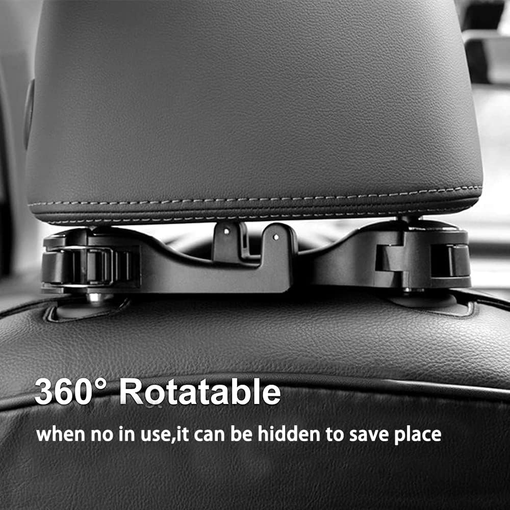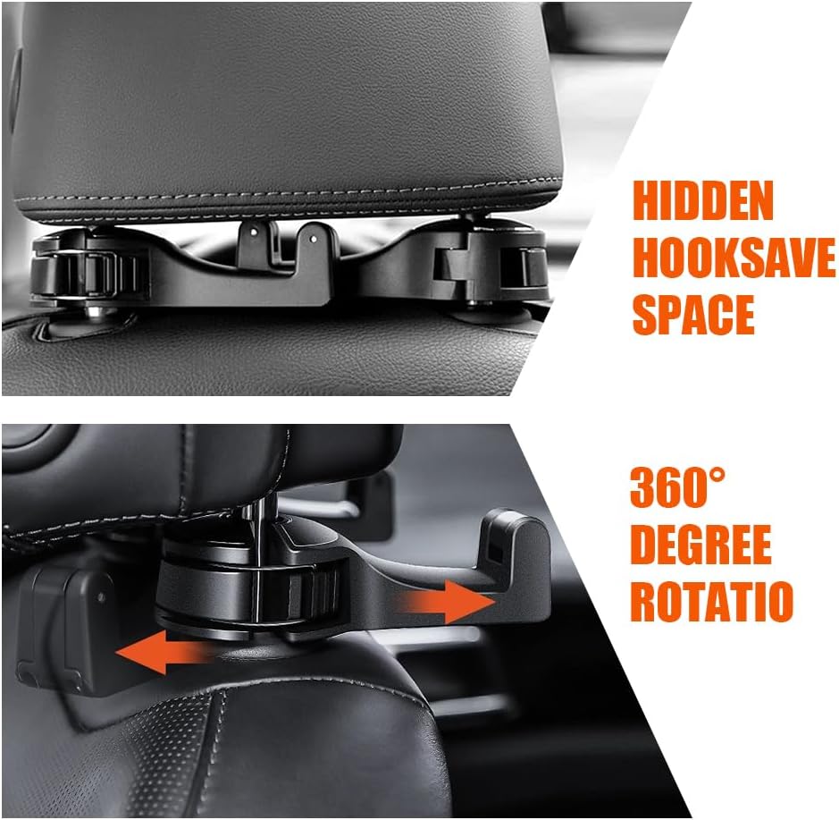 [دوران 360 درجة لتوفير المساحة]: يمكن أن يدور خطاف مسند رأس السيارة 360 درجة بعد التثبيت. يمكنك إخفاء خطافات السيارة عند عدم استخدامها، وتعليق الخطاف بشكل عكسي على المقاعد الأمامية أو الخلفية لتوفير المساحة ومنع الاصطدامات.