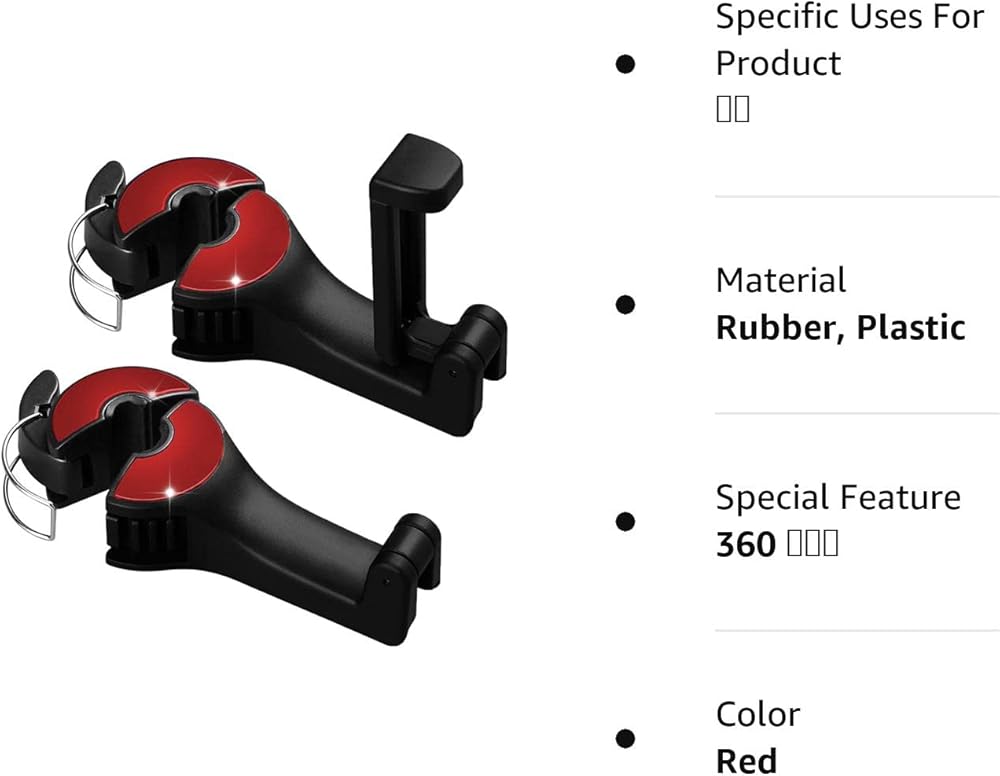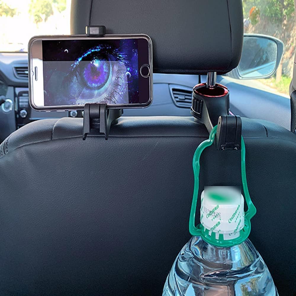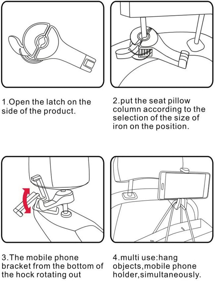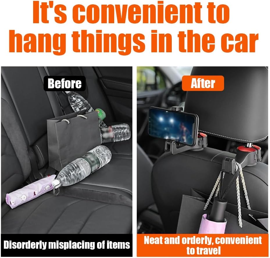 [توافق عالمي]: شماعة مقعد السيارة مصنوعة من مطاط ABS والسيليكون عالي الجودة، متينة. يمكن لخطاف السيارة هذا حمل ما يصل إلى 4-5 كجم. يمكن تعديل مشبك الذراع الخاص بحامل الهاتف المحمول بمرونة ليناسب الهواتف المحمولة مقاس 4 بوصة إلى 6 بوصة. خطافات مسند رأس السيارة مناسبة جدًا لتعليق البقالة والملابس والمظلات وحقائب اليد وما إلى ذلك.