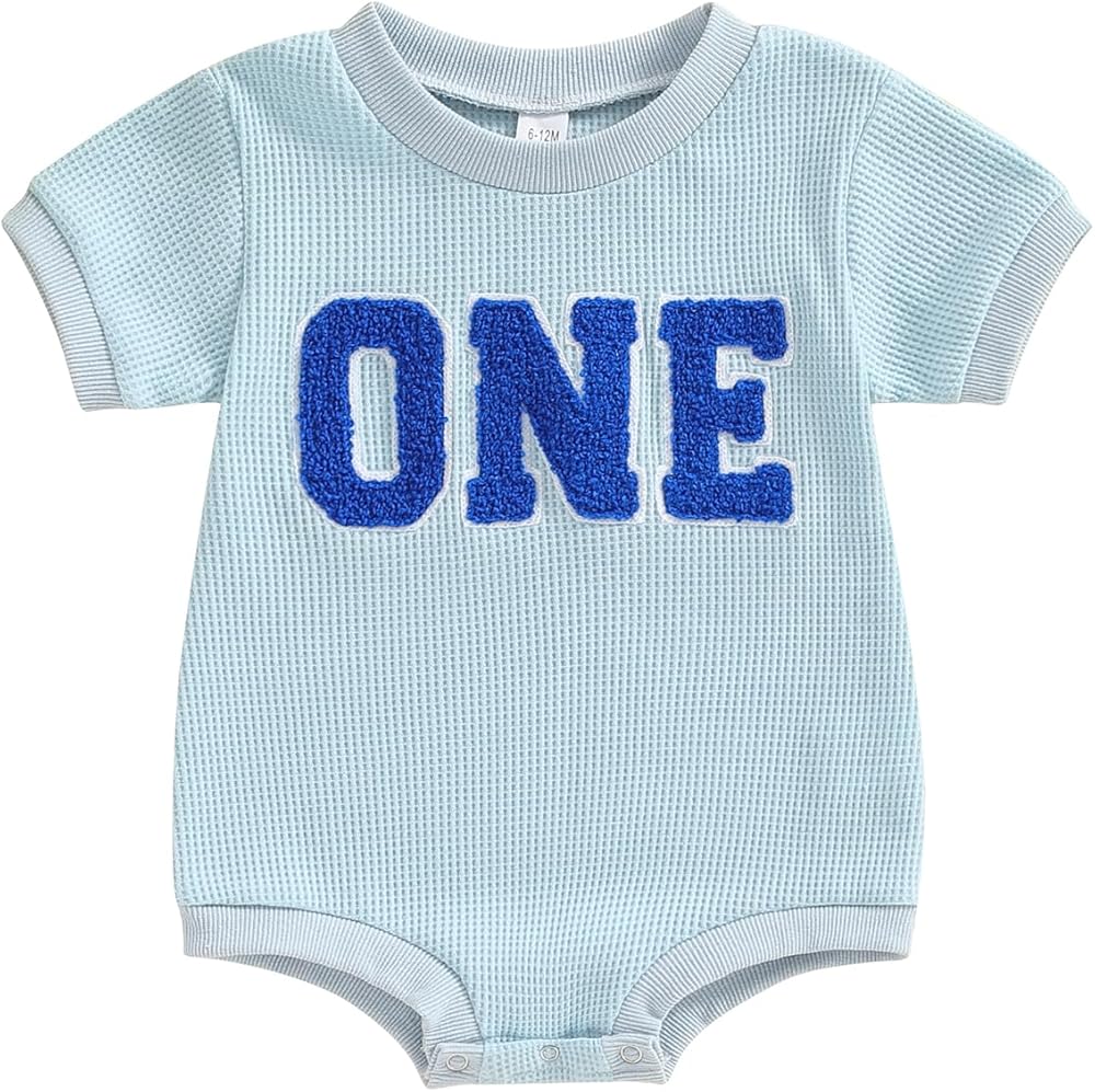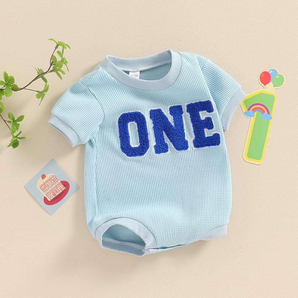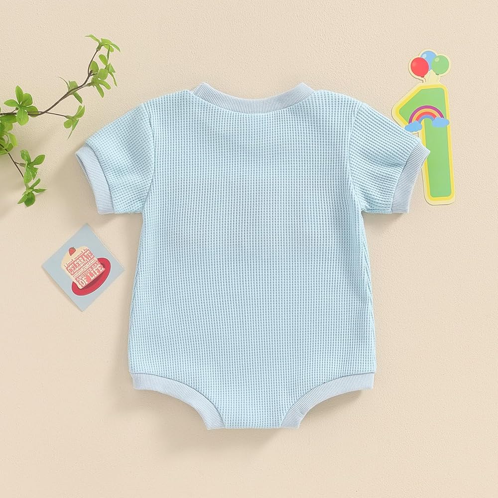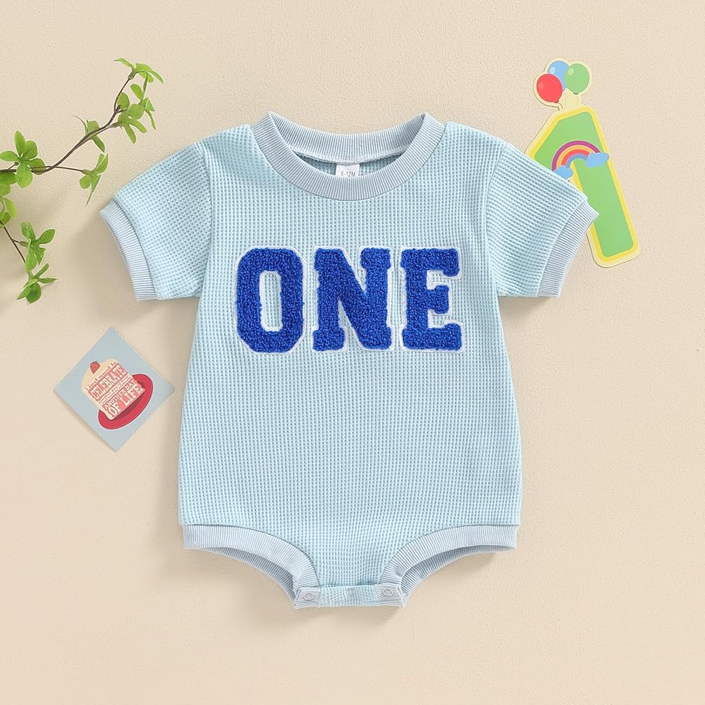 Toddler Baby Girl Boy Birthday Outfit "One" Embroidery Romper One Piece Bodysuit Waffle Summer Clothes