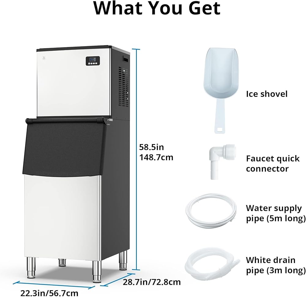 • سهلة التركيب والاستخدام: صانع الثلج الكبير قائم بذاته ويأتي مع عبوتين: آلة صنع الثلج وصندوق الثلج. يتم تضمين مغرفة ثلج كبيرة وأنابيب لمدخل ومخرج المياه وأدوات أخرى. ما عليك سوى تجميع صانعة الثلج وصندوق الثلج معًا، ثم توصيلهما بالماء والضغط على بضعة أزرار، وسيبدأ صنع الثلج.