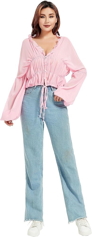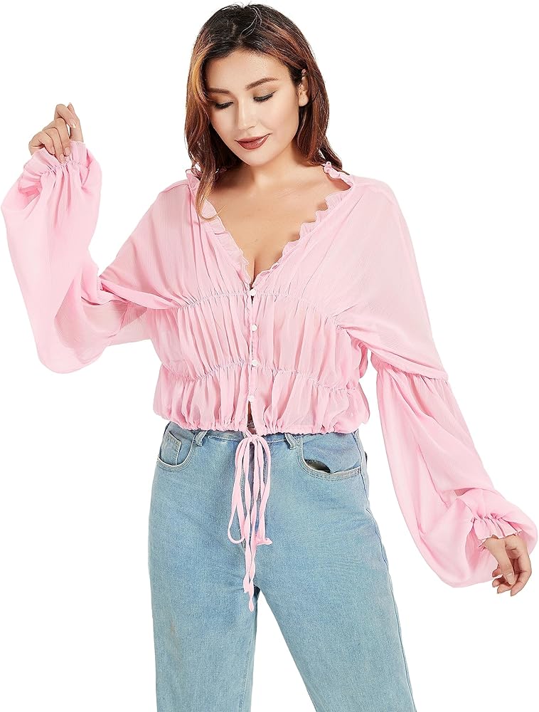 التصميم: رقبة على شكل حرف V، أكمام طويلة منتفخة، للشاطئ الصيفي، مضاد لحروق الشمس، بارد، ناعم وسريع الجفاف. بلوزة شيفون برباط الخصر.