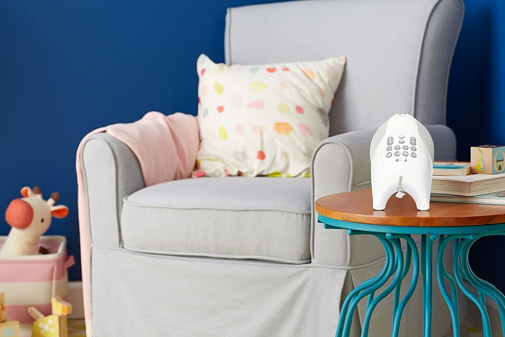 With plug-in power, our decor-friendly nightlight offers multiple ways to soothe baby, including music, lights and projection. Featuring a dimmable nightlight that emits a warm glow, it soothes baby with eight gentle melodies and calming nature sounds