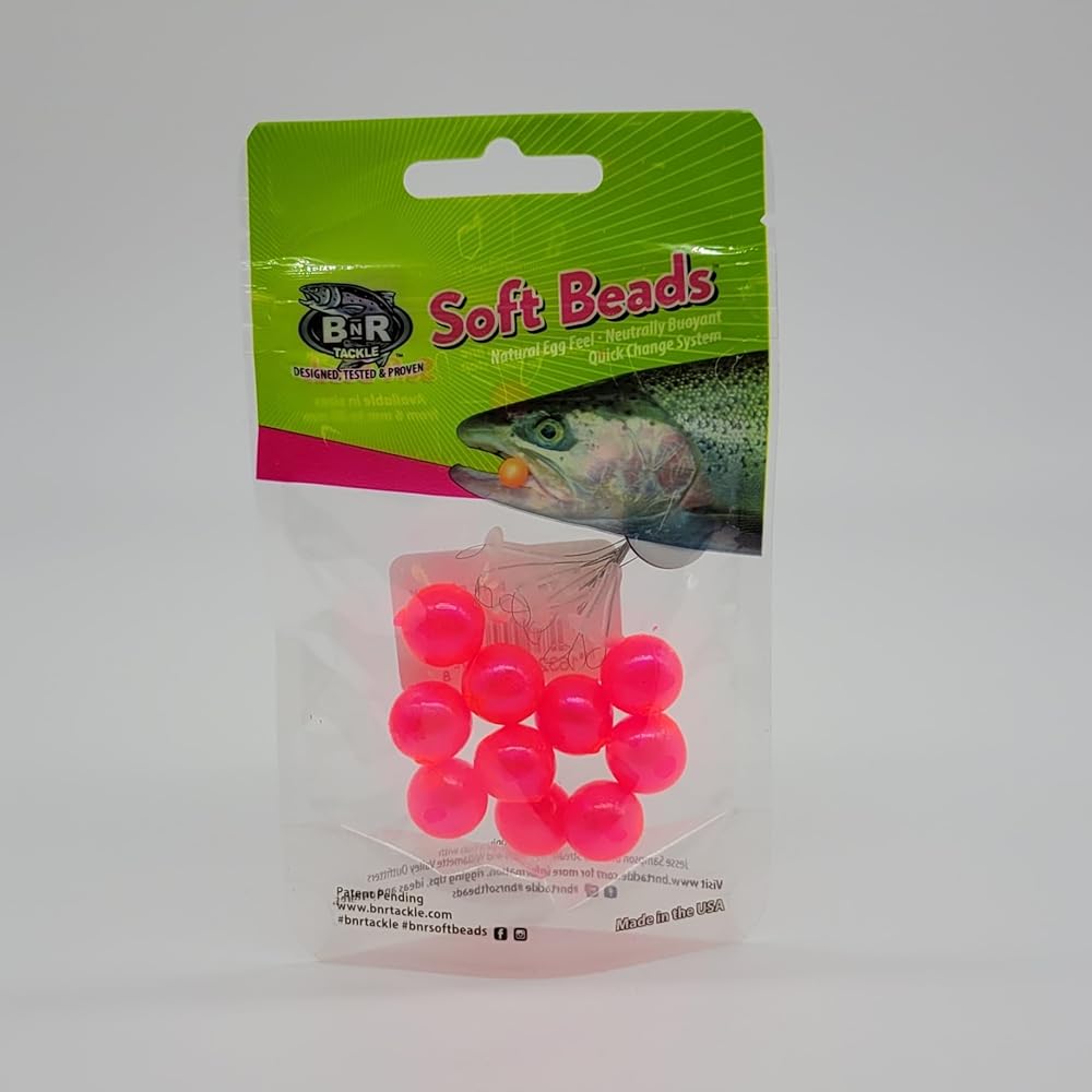 BnR Tackle Soft Beads are incredibly effective steelhead soft baits that imitate fish eggs drifting down a stream. The soft consistency and neutral buoyancy give them a very natural appearance as they drift down creeks, streams, and other runs where steelhead, trout, and salmon are targeted. BnR Tackle Soft Beads are made in an incredibly wide range of colors, including natural colors designed to mimic fresh eggs as well mottled colors which more closely resemble eggs that are a few days old. There's also a considerable range of more exotic blended colors as well as ones designed for specific fisheries in both the Pacific Northwest and Great Lakes regions. Check out the video linked above for instructions and details on rigging soft beads. Eack pack includes 10 soft beads and appropriately sized T-Stops for rigging.