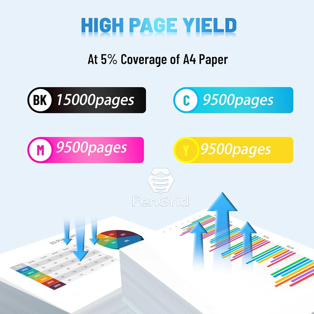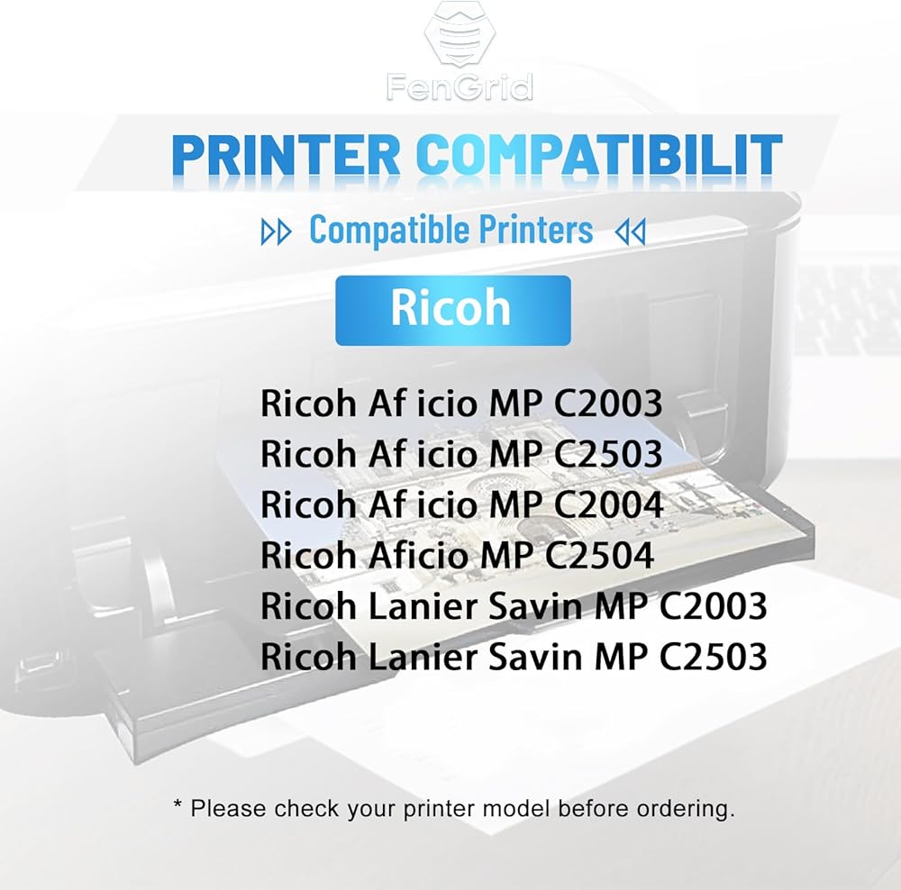 Page yield: Up to 15,000 pages per 841918 black cartridge and Up to 9,500 pages per 841919 841920 841921 color cartridge (at 5% coverage, Letter). Get up to more pages with FenGrid MP C2503 toner unit compared to standard one.
