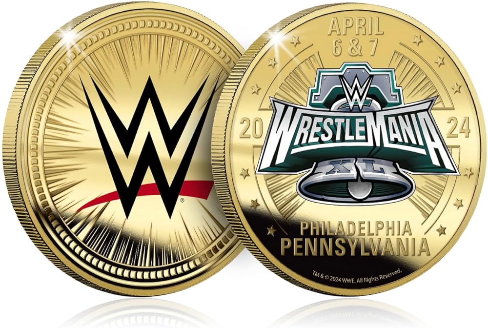 Wrestlemania returns to Philidelphia this April for its 40th instalment, Wrestlemania XL. See the formidable Cody Rhodes face off against the current Undisputed WWE Universal Champion Roman Reigns to win the WWE Championship title. Be part of the action with this Official WWE WrestleMania Event Commemorative, supersized to 50mm and plated in gold. Feel the roar of the crowd and get swept up in the action with this awesome piece of WWE merchandise that can be treasured for years to come. Collect yours now before it is too late. Specification - Base Metal: Iron, Plating: .999 Gold, Diameter: 50 mm / 1.97 In, Finish: Proof-like.