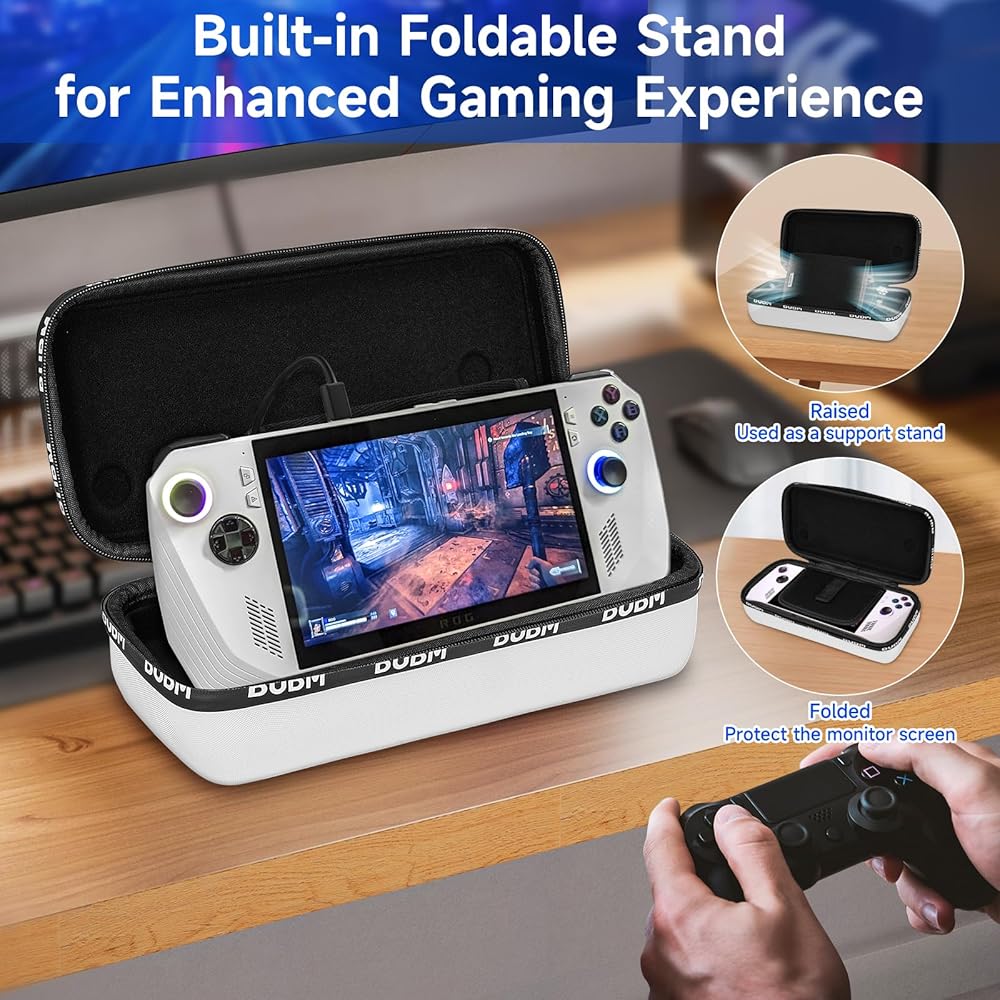 【Foldable Support Stand】The handheld case compatible for asus rog ally has a built-in foldable support stand. It can be used as a support stand when raised, protect the monitor screen from scratches when folded, and increase the distance between the top and the joystick to avoid squeezing the joystick.