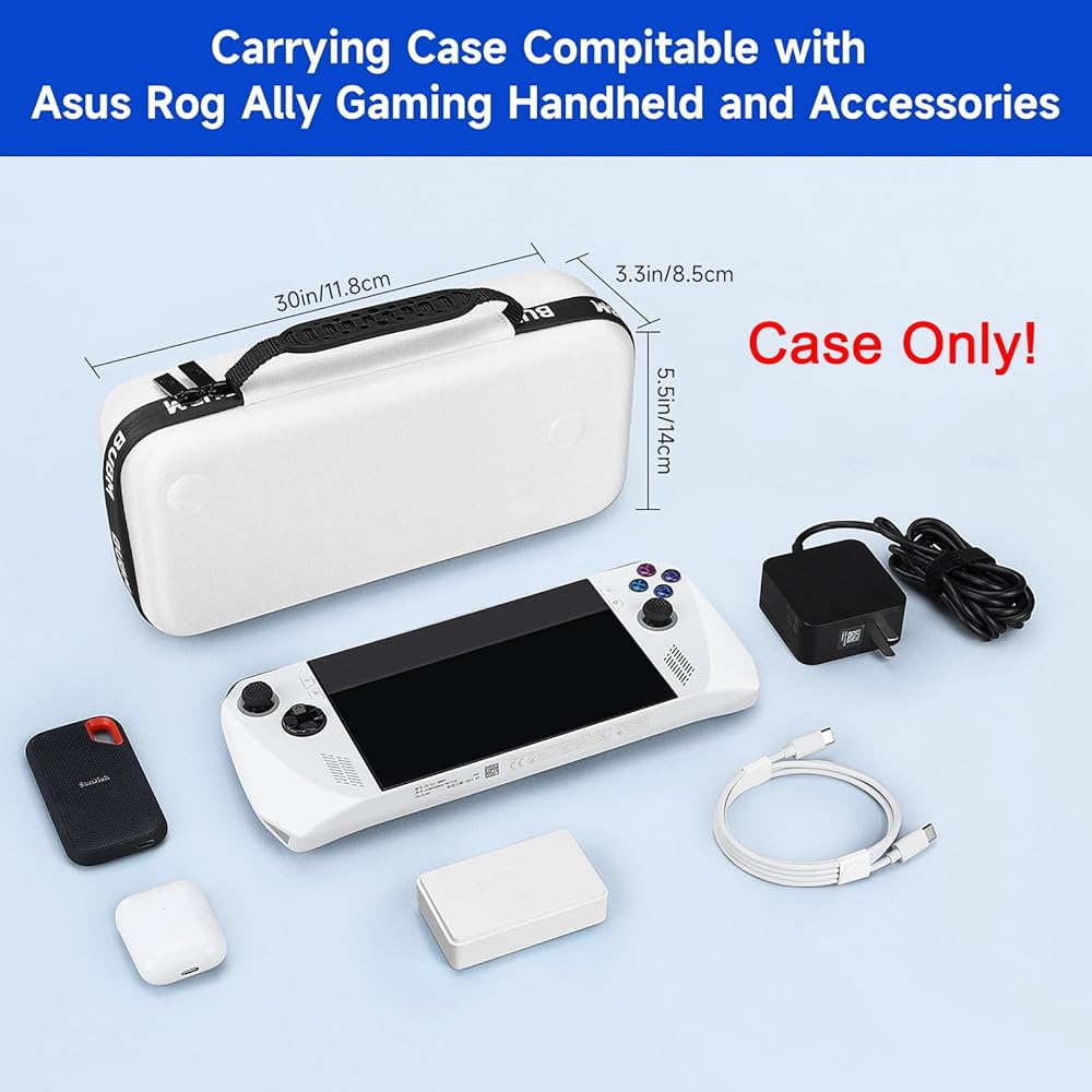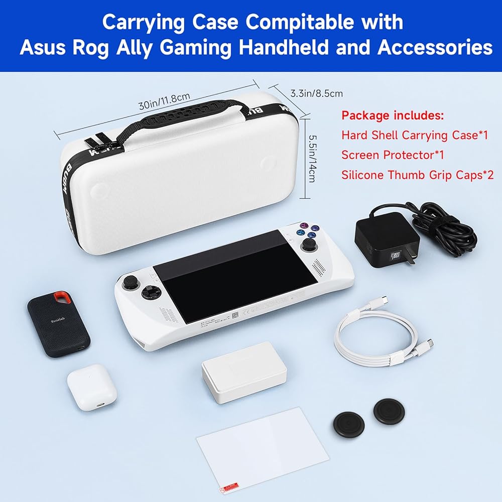 【Specially Designed】Size: 30*8.5*14cm, a hard shell carrying case specially designed for ASUS ROG ALLY. Package includes: hard carrying case bag compatible for asus rog ally*1, screen protector*1, silicone thumb grip caps*2. (If accessories are missing, please feel free to contact us)