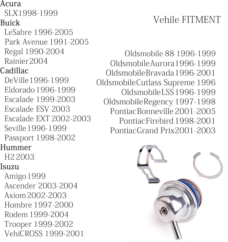 • 🚗متوافق مع Acura SLX 1998-1999.Buick LeSabre 1996-2005، Park Avenue 1991-2005، Regal 1990-2004، Rainier 2004.Cadillac DeVille 1996-1999، Eldorado 1996-1999، Escalade 199 9-2003، إي إس في 2003، تحويلة 2002-2003، إشبيلية 1996-1999. منظم ضغط حقن الوقود