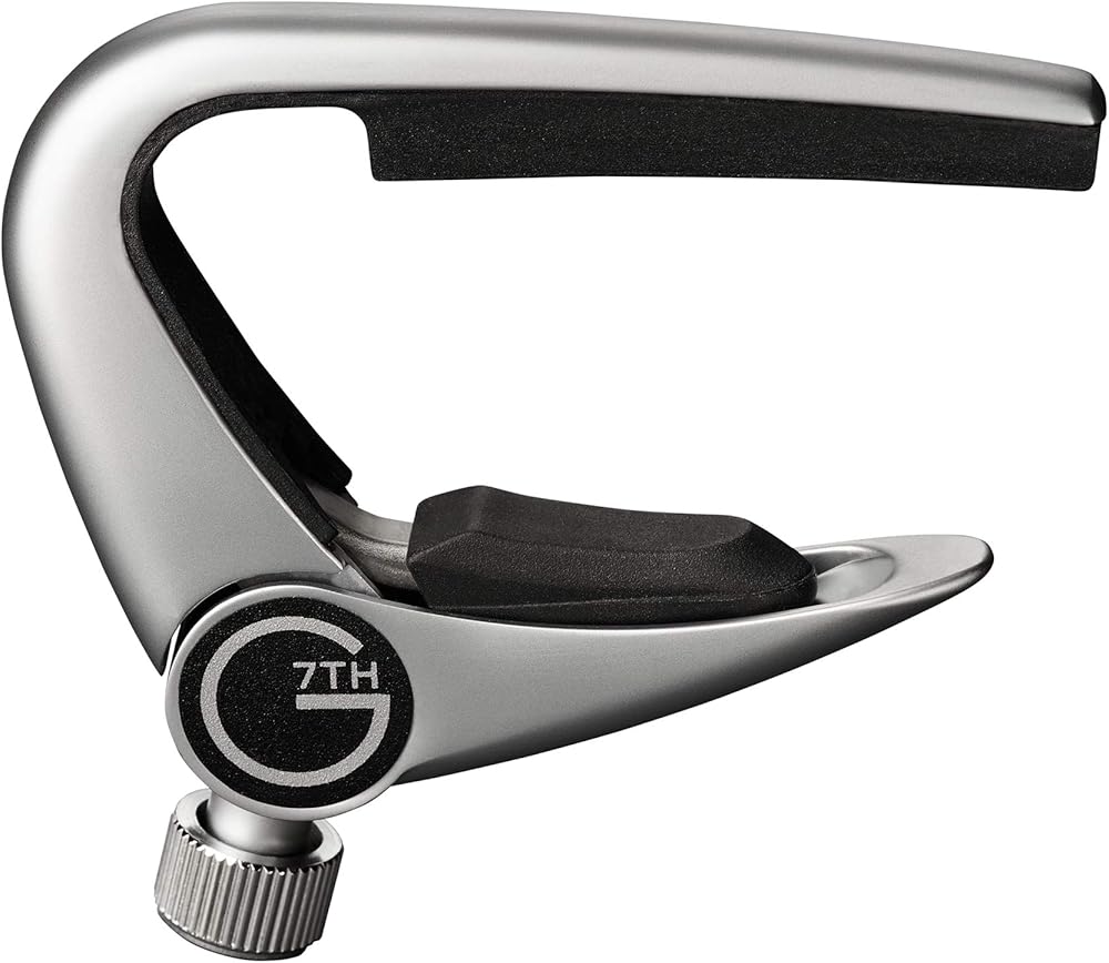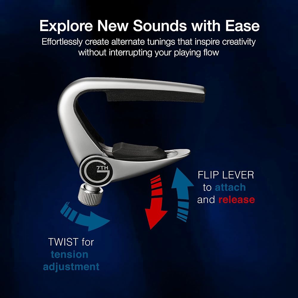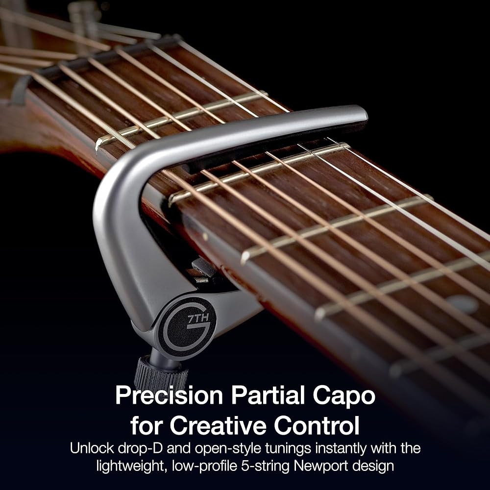 Fast, easy open tuning without retuning! The Newport partial #3 is a cut capo in the Newport series combining traditional flip lever action, with a low-profile and classic G7th design. This quick-release partial capo clamps 3 strings for ensues, or use upside down for open a. Then simply flip the lever to release and you're instantly back in standard tuning! The Newport's low profile doesn't interfere with your fretting hand, while its fine tune adjustment dramatically reduces tuning problems. As on all G7th capos, the inert silicone wrap around rubber and internal G7th design features eliminate deadening of tone and avoid dangerous metal to wood contact on your guitar neck.