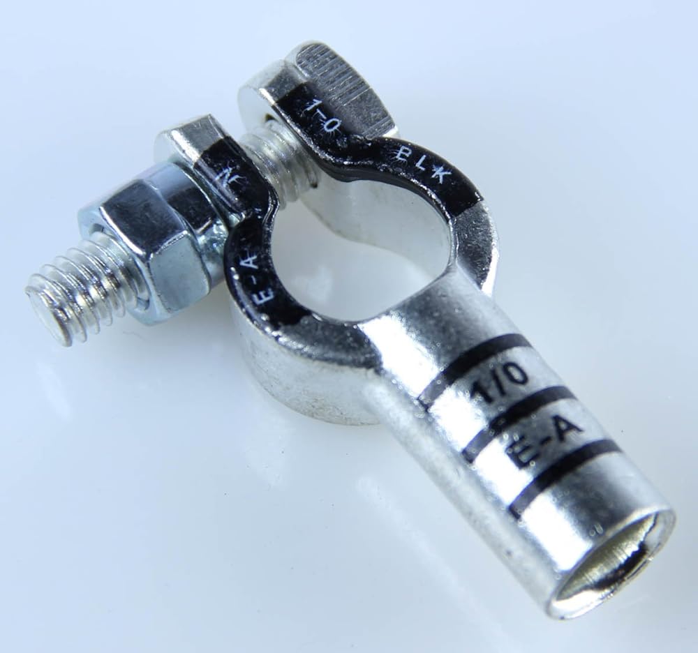 1/0 gauge negative copper battery terminals. Includes bolt and nut. Battery terminals made of 95% pure copper with bright tin plating. Features wire size and polarity markings. Includes nut and bolt. Can be crimped or soldered.