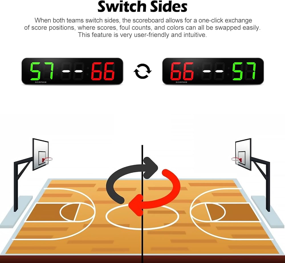 【تبديل الجوانب】-- عندما يحتاج كلا الجانبين إلى تبديل الجانبين أثناء اللعبة، تدعم لوحة النتائج التبديل بلمسة واحدة لموضع النتيجة ويمكن أن يتبع لون LED المفتاح، وهو أمر مفيد جدًا للإشارة إلى نتيجة كلا الجانبين بشكل صحيح.