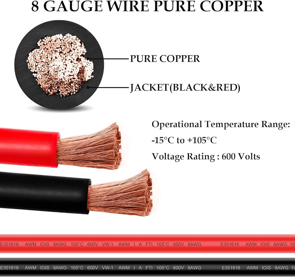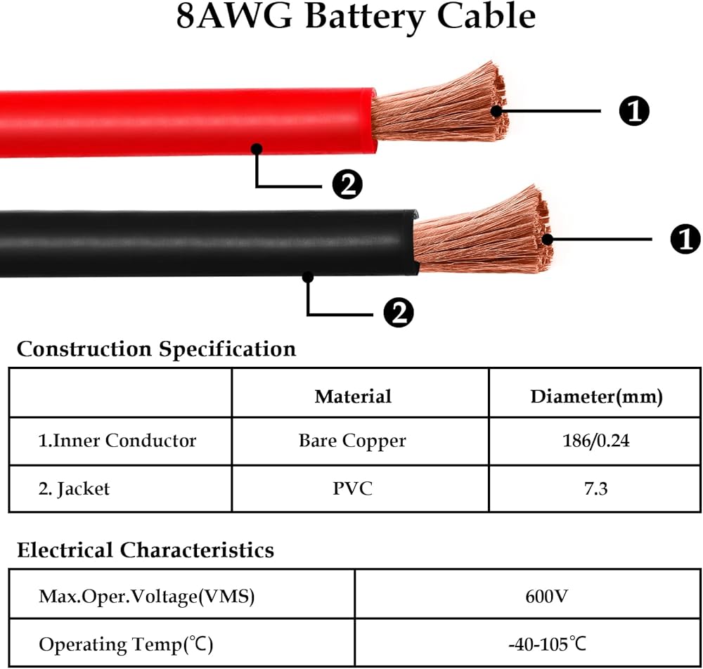 كابل البطارية مصنوع من سلك عالي التحمل بمقياس 2، والأسلاك النحاسية النقية تمنع التآكل وتسمح باللحام بسهولة أكبر، كما أنها سميكة جدًا ومتينة. سترة عازلة من مادة PVC لمقاومة التآكل وتحمل الظروف القاسية. مقاومة للحرارة حتى 100 درجة مئوية، التيار المقدر: 200 أمبير، تصنيف الجهد: 618 فولت.