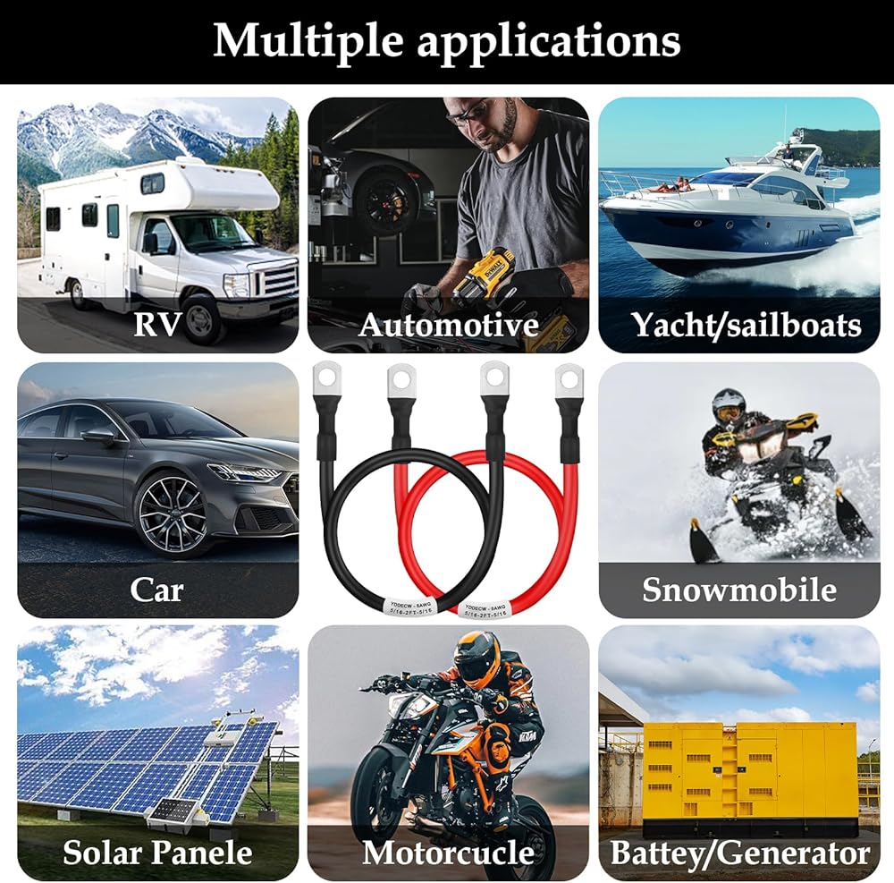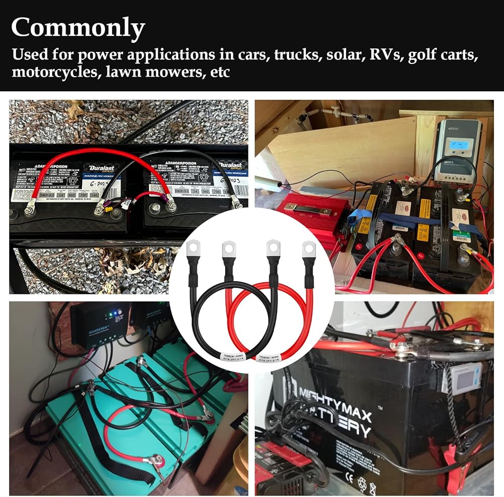 تُستخدم كابلات البطارية على نطاق واسع لتطبيقات الطاقة في السيارات والشاحنات والطاقة الشمسية والمركبات الترفيهية وعربات الجولف والدراجات النارية وجزازات العشب وما إلى ذلك.