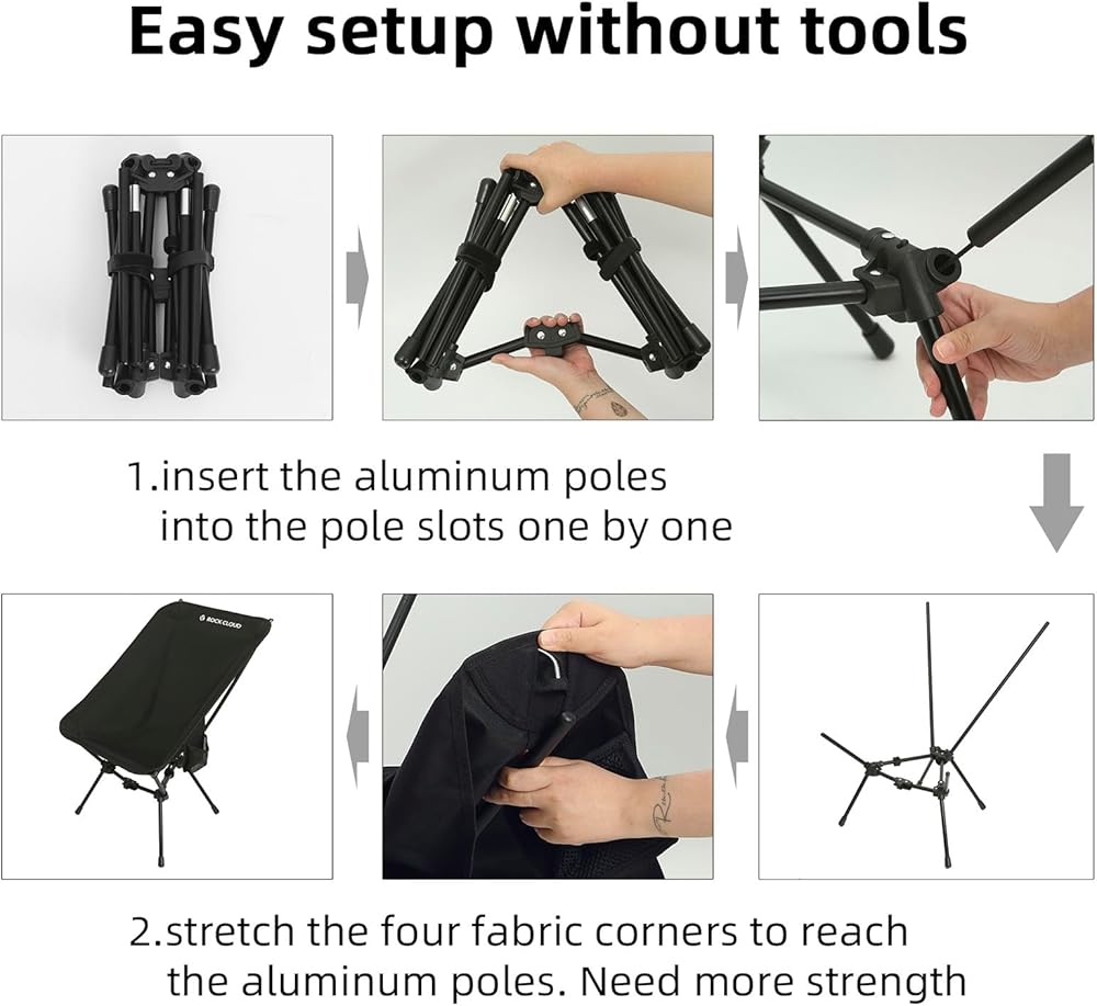 التثبيت في ثوان: نظام عمود ألومنيوم خفيف الوزن مع اتصال دليل يدوي. يسمح لك الإطار الرئيسي للكرسي القابل للطي بسلك الصدمات بتوجيه الأعمدة المتصلة مباشرة إلى الإطار. يمكّنك هذا التصميم الفريد من فتحه وإرفاق قماش المقعد وستكون جاهزًا للانطلاق! تصميم حلقة الحبل يجعل عملية التجميع أكثر سهولة وتوفيرًا للجهد