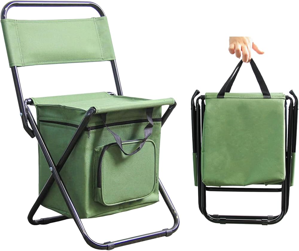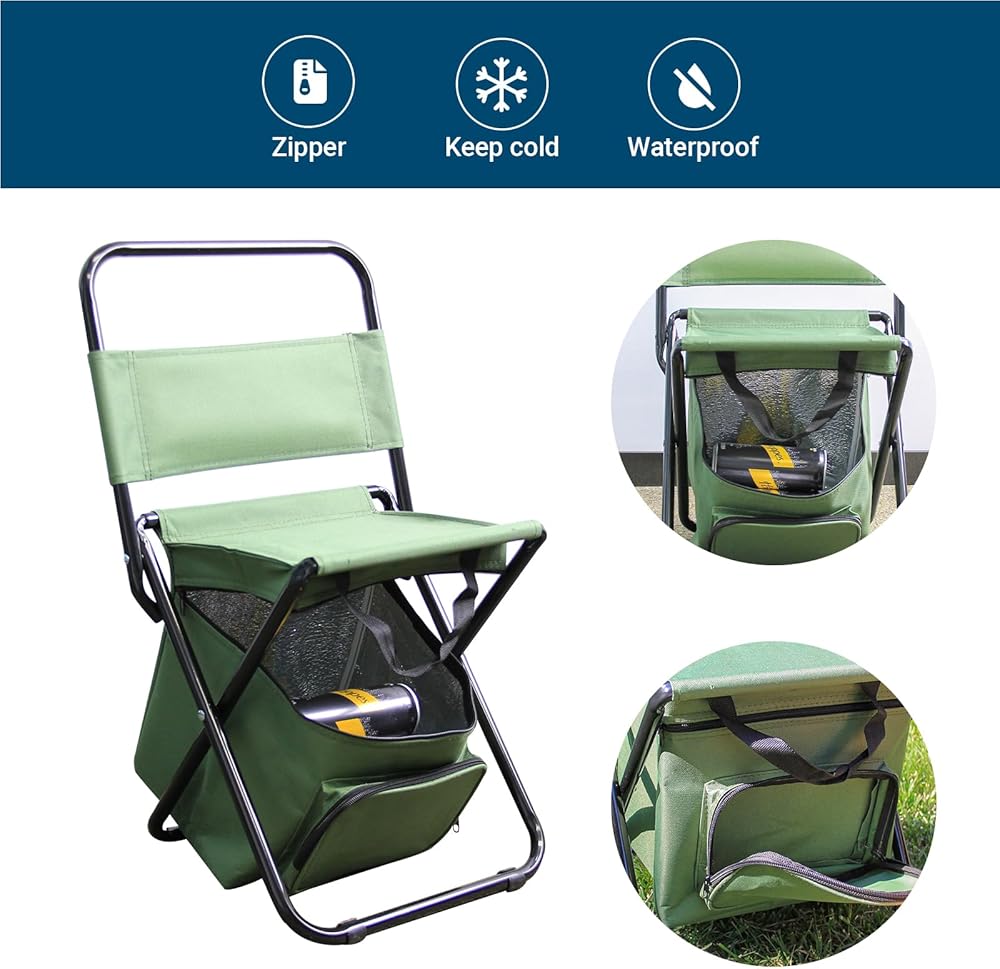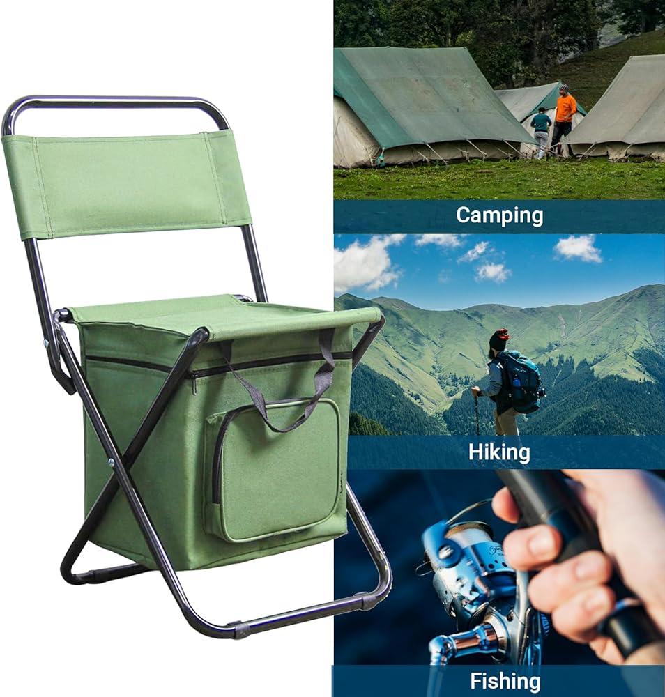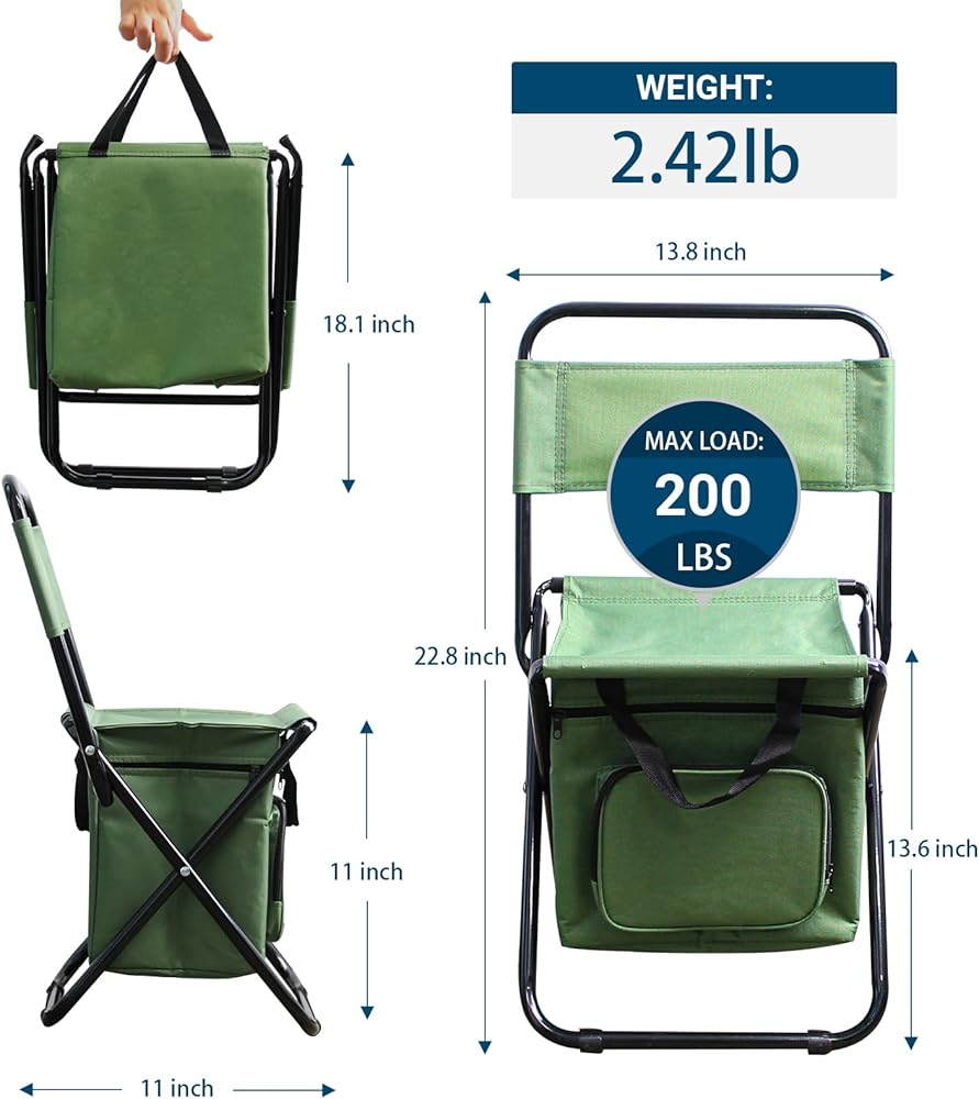 Folding Portable Cooler Chair: The backpack stool chair only 2.42lbs.This camping chair has widened double handle design make you feel comfortable for easy carry. Folded dimensions: 18.1'' L x 13.6'' H x 1.8'' W, equipped with a bag of 9.8 x 7.3 x 10.6 inches to provide space to hold some foods and drink.It folds down nicely for travel.You can pack it and store in the trunk of your car to take with you anywhere you want.