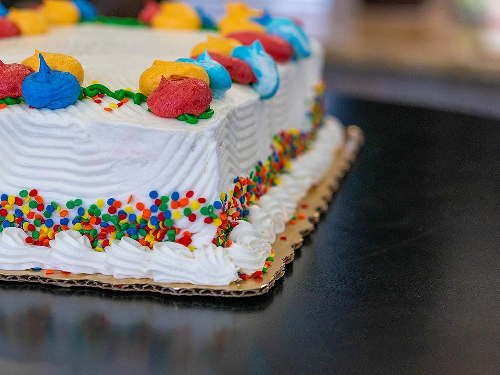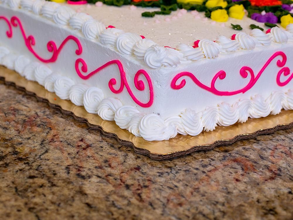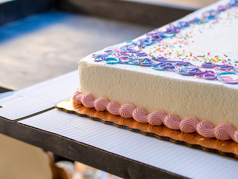 Sturdy cake pads are made from strong fluted corrugated material. Mylar coating provides moisture and grease barrier. Attractive, scalloped edge and bright color give a clean, professional presentation of decorated cakes.